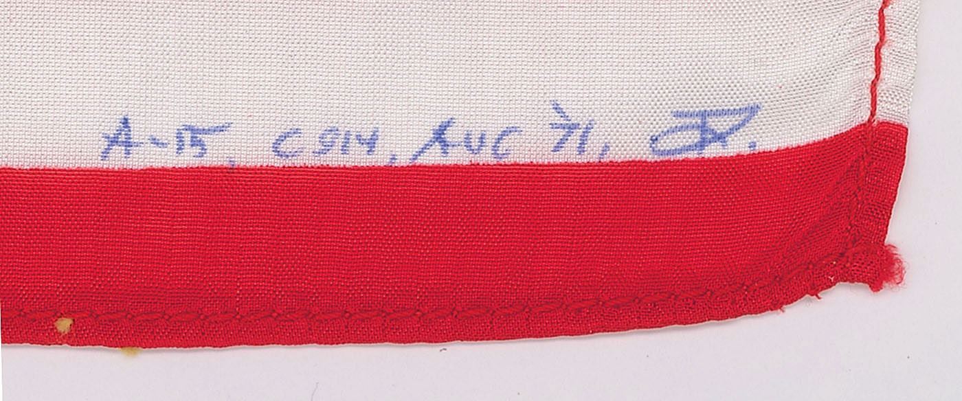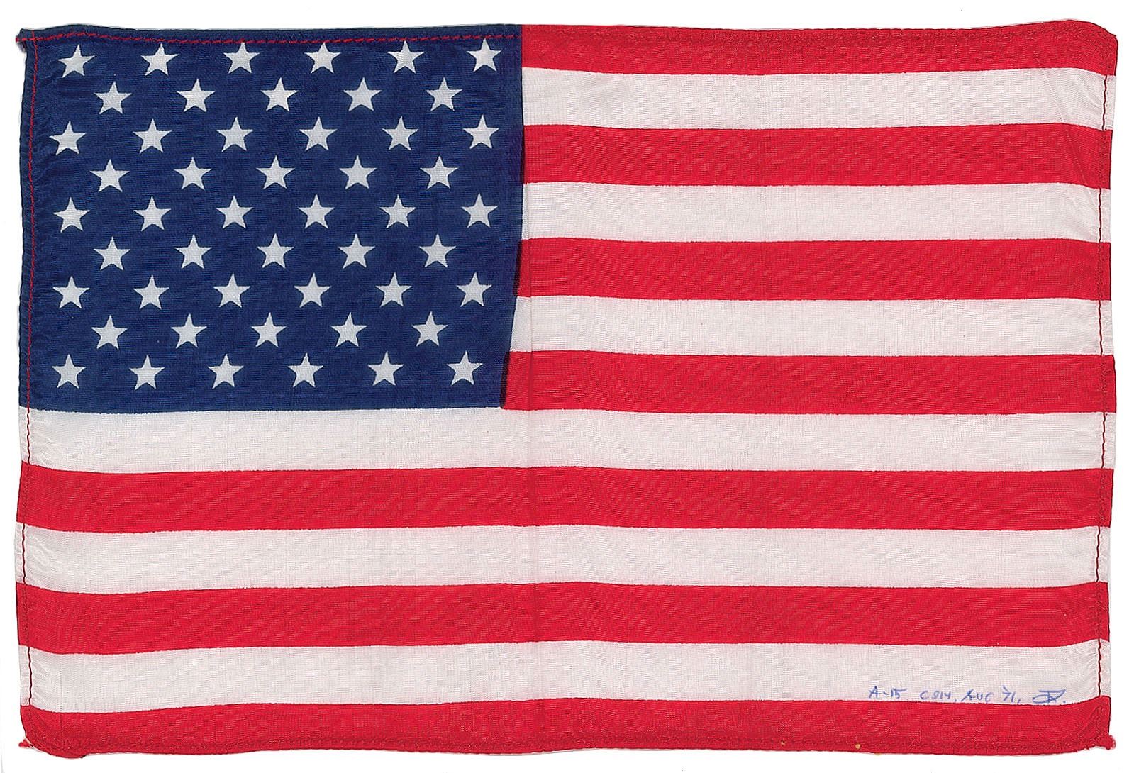Supremely desirable mid-sized flown American flag carried into lunar orbit on Apollo 15, 11.5 x 7.5, signed in the lower right corner in blue ballpoint by Dave Scott with his first initial, "D," adding, "A-15, CSM Aug. '71." In fine condition, with a central vertical fold, and a fold to the upper right corner. Accompanied by a signed letter of provenance from Scott, in part: "I hereby certify that the medium United States flag…is from my personal collection and was flown aboard the Command and Service Module (CSM) Endeavor in lunar orbit for six days during Apollo 15, July 26–August 7, 1971…After orbiting the Moon for a day in preparation for the landing, Jim Irwin and I landed the lunar module ‘Falcon’ on the Moon between Hadley Rille and the Apennine Mountains…During the three days we were on the Moon, Al Worden flew the ‘Endeavor’ solo in lunar orbit…The ‘Falcon’ remained on the lunar surface for 66 hours and 54 minutes, after which we launched and completed a direct rendezvous…docking with the Command and Service Module (CSM) ‘Endeavor’ in lunar orbit, after which we spent two more days in lunar orbit conducting scientific experiments and photography…This Apollo 15 medium United States Flag has been in my personal collection since returning to Earth.” A fine example of one of the most highly sought flown formats. From the personal collection of Dave Scott.