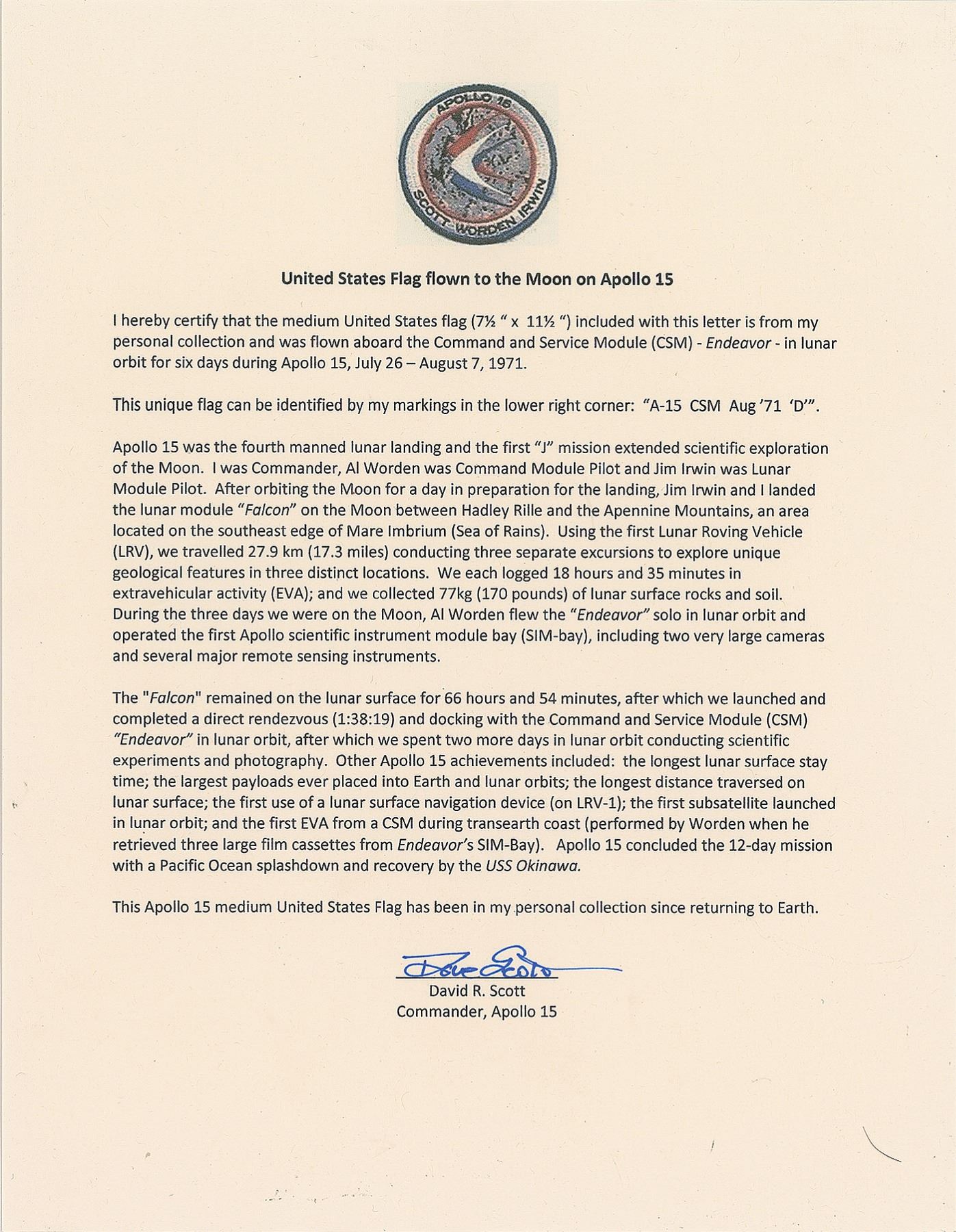 Supremely desirable mid-sized flown American flag carried into lunar orbit on Apollo 15, 11.5 x 7.5, signed in the lower right corner in blue ballpoint by Dave Scott with his first initial, "D," adding, "A-15, CSM Aug. '71." In fine condition, with a central vertical fold, and a fold to the upper right corner. Accompanied by a signed letter of provenance from Scott, in part: "I hereby certify that the medium United States flag…is from my personal collection and was flown aboard the Command and Service Module (CSM) Endeavor in lunar orbit for six days during Apollo 15, July 26–August 7, 1971…After orbiting the Moon for a day in preparation for the landing, Jim Irwin and I landed the lunar module ‘Falcon’ on the Moon between Hadley Rille and the Apennine Mountains…During the three days we were on the Moon, Al Worden flew the ‘Endeavor’ solo in lunar orbit…The ‘Falcon’ remained on the lunar surface for 66 hours and 54 minutes, after which we launched and completed a direct rendezvous…docking with the Command and Service Module (CSM) ‘Endeavor’ in lunar orbit, after which we spent two more days in lunar orbit conducting scientific experiments and photography…This Apollo 15 medium United States Flag has been in my personal collection since returning to Earth.” A fine example of one of the most highly sought flown formats. From the personal collection of Dave Scott.