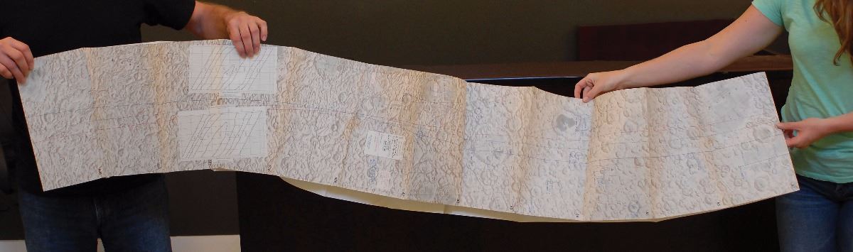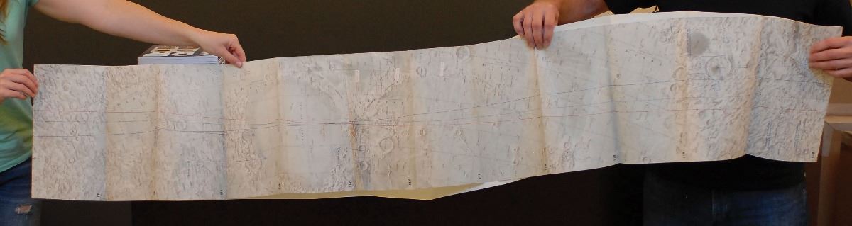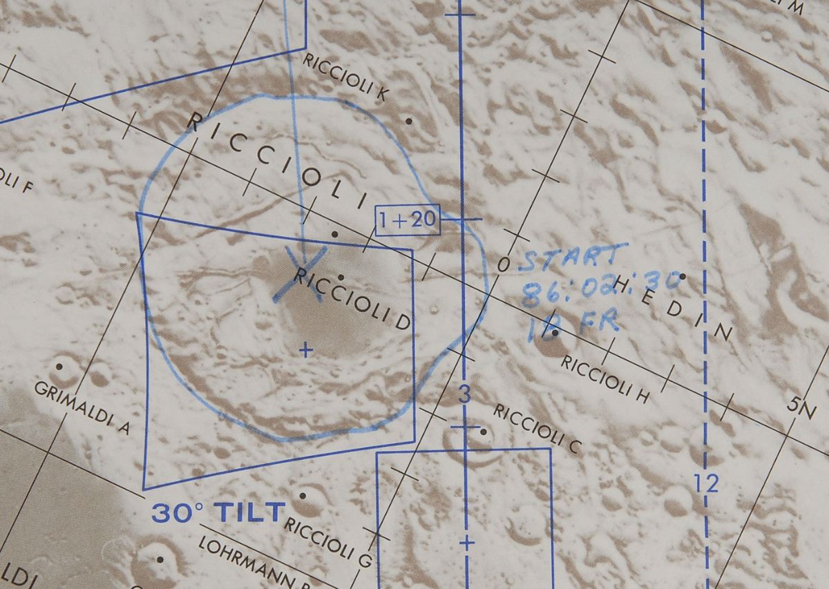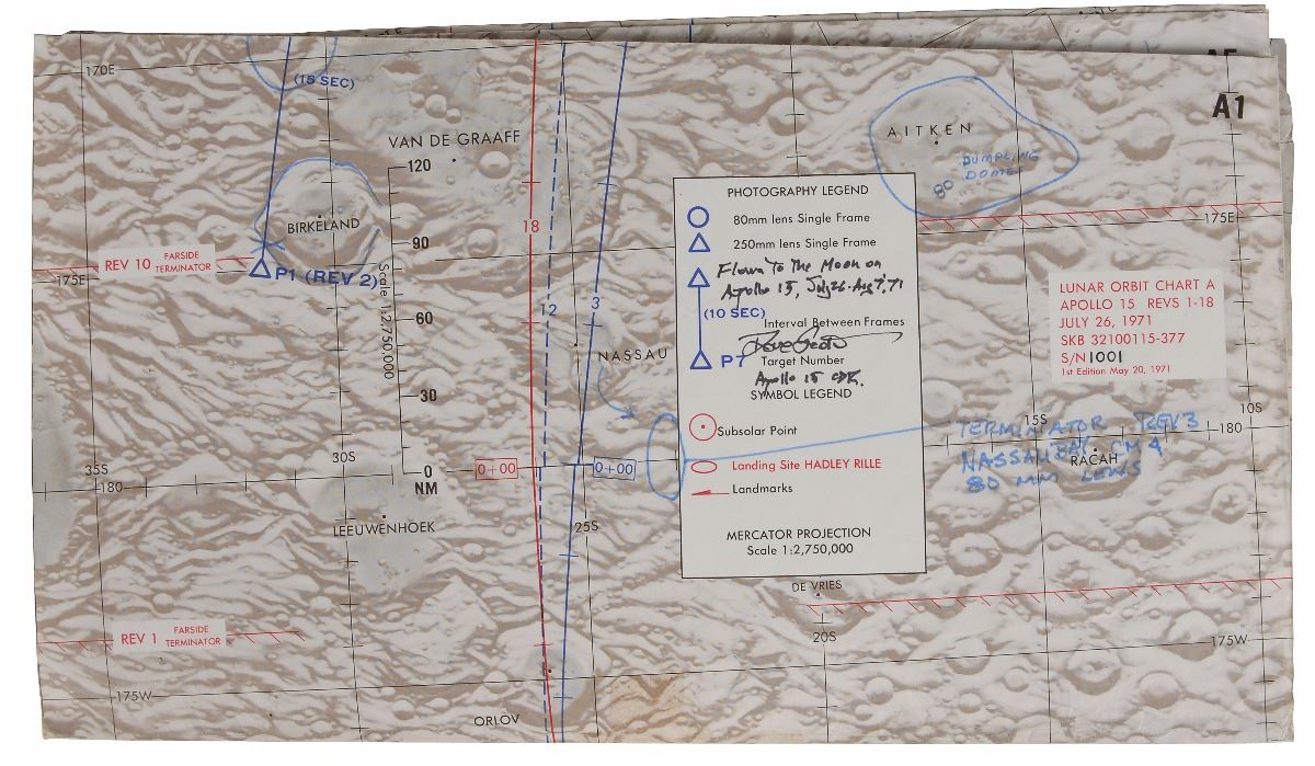 Exceptional flown Apollo 15 lunar orbit chart, folded to 13 x 7.5, signed and flight-certified in the photography legend in black felt tip, “Flown to the Moon on Apollo 15, July 26–Aug 7, ’71, Dave Scott, Apollo 15 CDR.” The chart is comprised of twenty-four map plates taped together at the center which if detached and unfolded would measure over fourteen feet long. The chart depicts the entire lunar surface during revolutions 1 through 18, and is labeled on the first panel, “Lunar Orbit Chart A, Apollo 15 Revs 1–18, July 26, 1971, SKB 32100115-377, S/N 1001, 1st Edition May 20, 1971.” The landing site is shown on page A13, and the map provides appropriate information for photographing the areas depicted. Map features extensive blue ink notations in another hand. In fine condition, with a crease to one page.