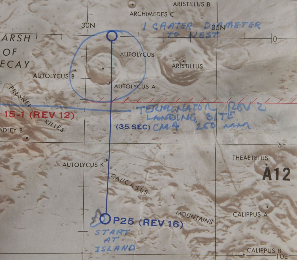 Accompanied by a signed letter of authenticity from Scott, in part: “I hereby certify that the Apollo 15 ‘Lunar Orbit Chart A’ is from my personal collection and was flown in lunar orbit for six days aboard the CSM Endeavor during Apollo 15…This chart is comprised of 21 map plates depicting the entire lunar surface covered during revolutions 1 through 18…This unique Chart also contains a handwritten circle in blue around the crater ‘Aitken’ with blue handwritten notations, ‘Terminator Rev 3 Nassau Bay CM 4 80 mm lens,’ indicated by a hand circle and arrow from the crater ‘Nassau.’ This is one of four such charts used by the crew for hand-held Hasselblad orbital photography during our six days in lunar orbit…Lunar Orbit Charts portray lunar topography by shaded relief with a western illumination, and include revolution numbers, and times of crossing…The Photograph Legend information includes symbols for the lens to be used (80mm or 250mm), the time interval between frames, and a target number. Ground tracks below the orbit are marked by red and blue lines…This ‘Lunar Orbit Chart A’ has been in my personal collection since returning to Earth.” An intricately detailed and visually impressive piece with ideal provenance.