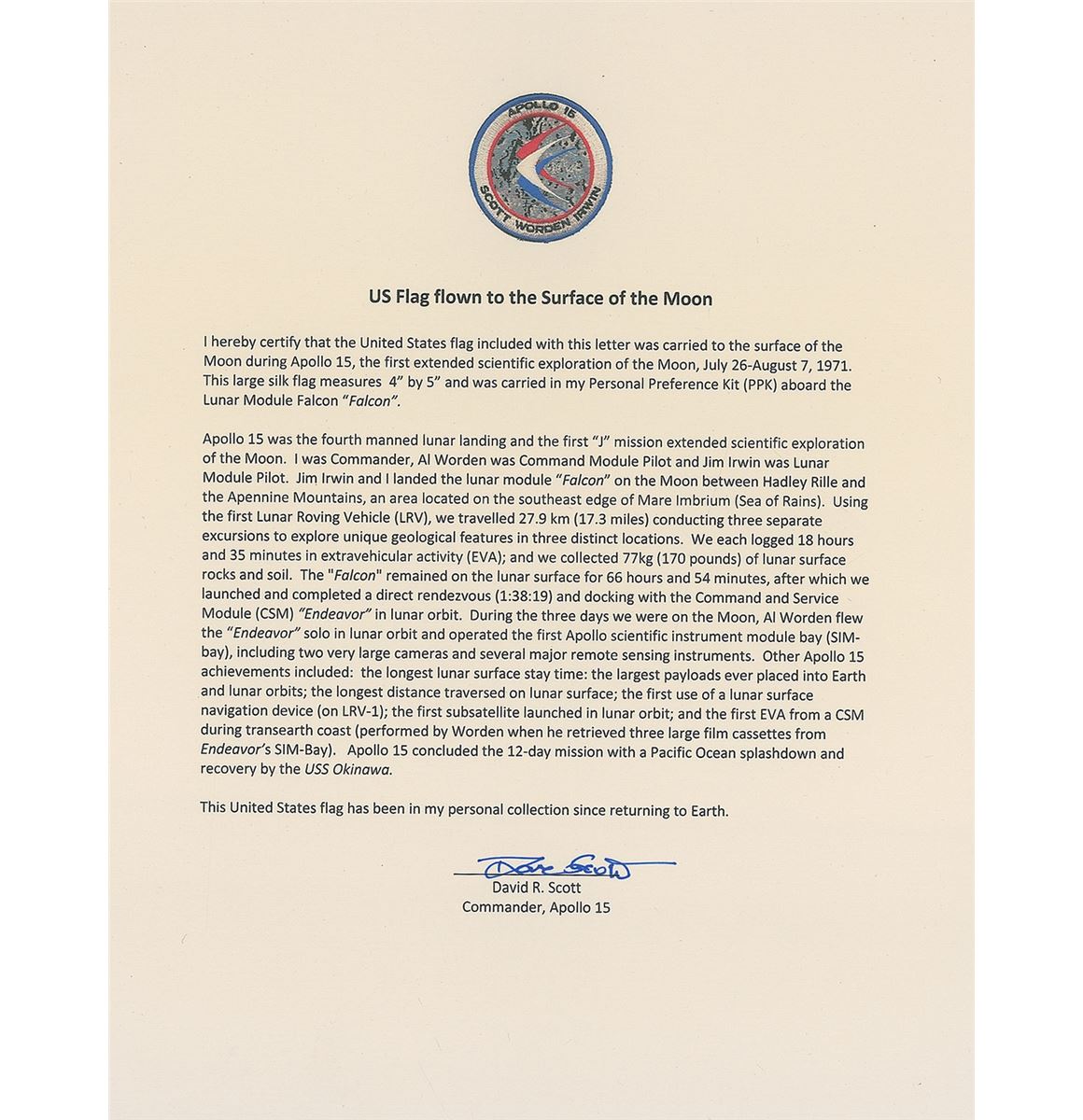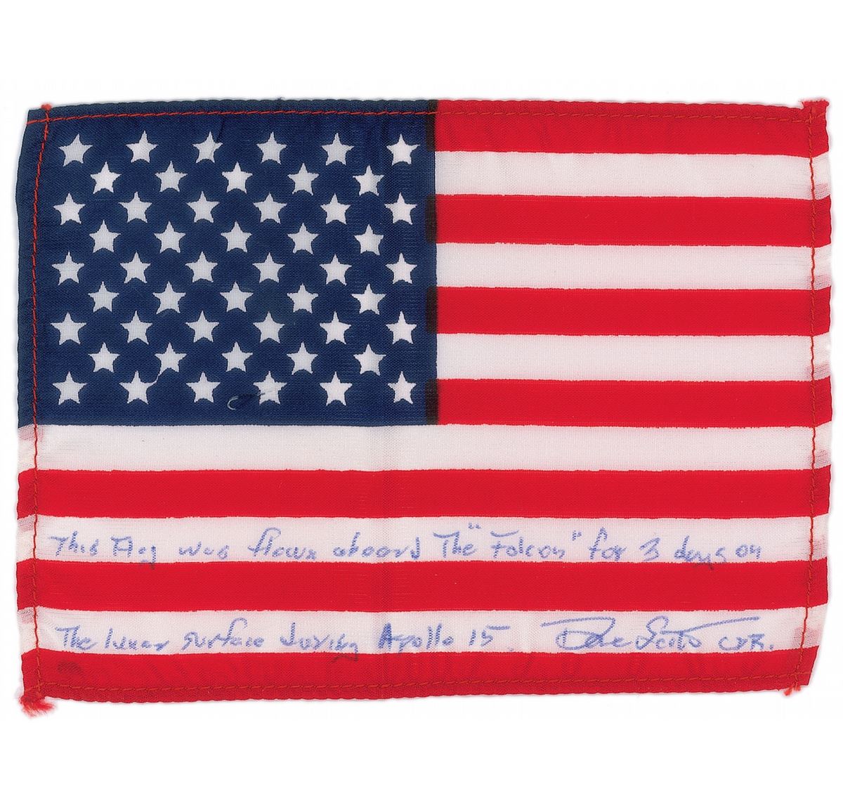 Highly sought-after flown American flag carried on the Apollo 15 mission, 5.5 x 4, signed and flight-certified in blue ballpoint, “This flag was flown aboard the ‘Falcon’ for 3 days on the lunar surface during Apollo 15, Dave Scott CDR.” In fine condition, with a central vertical fold. Accompanied by a signed letter of provenance from Scott, in part: “I hereby certify that the United States flag…was carried to the surface of the Moon during Apollo 15…carried in my Personal Preference Kit (PPK) aboard the Lunar Module ‘Falcon’…This United States flag has been in my personal collection since returning to Earth.”