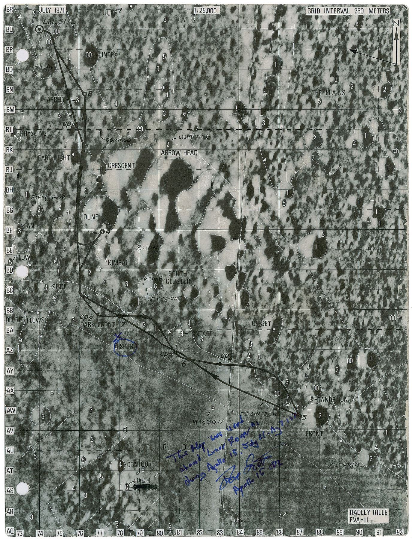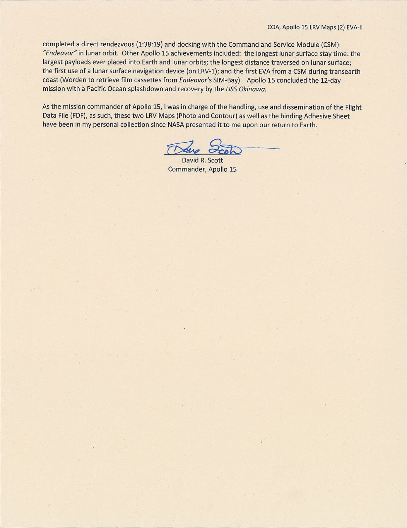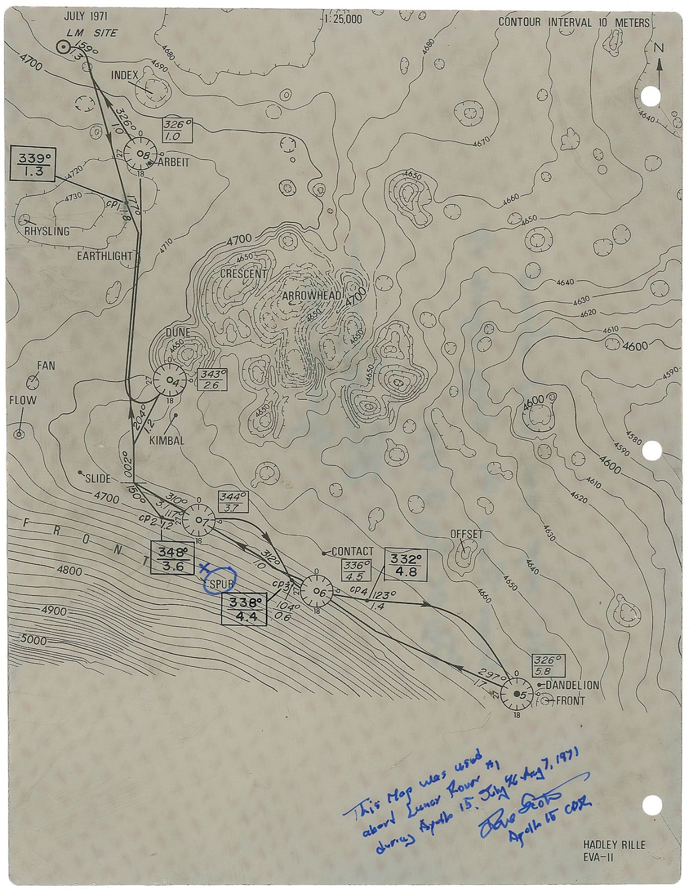 Dave Scott's incredible lunar flown Hadley Rille EVA II photo and contour maps carried aboard the Lunar Roving Vehicle 1 for three days of lunar surface exploration during the Apollo 15 mission. Both maps measure 8 x 10.5 and consist of the same 1:25,000 scale section of the Hadley Apennine region and the second planned traverse route of the LRV. Mission Commander Scott has signed and flight-certified the front and back to both maps in blue and black felt tip, "This map was used aboard Lunar Rover #1 during Apollo 15, July 26–Aug 7, 1971, Dave Scott, Apollo 15 CDR," and has circled and marked the location of the "Spur" crater on both maps. Also included is the original same-size adhesive sheet used to affix the maps back-to-back, which is also signed and flight-certified in blue felt tip, "This adhesive sheet was used to bind together the LRV Photo Map for EVA–II and the LRV Contour Map for EVA–II, during Apollo 15, July 26–Aug 7, 1971, Dave Scott, Apollo 15 CDR." Both maps include crater names and planned exploration stations for the EVA-II. Contour lines on both maps depict the relative height above the base altitude of the moon, with white lines on photo map showing major elevations, and black lines on contour map showing detailed elevations; circular notes at each station define the bearing and distance from the station back to the lunar module. The photo map also bears black ink notations by an unknown hand, which identifies various craters and craterlets such as: Domingo, Lightning, Blinky, Fifty One, Window, Tecumseh, Exuperay, and High. These maps were temporarily removed from a book of 'LM Lunar Surface Maps' and mounted to a rover post with a large clip for three days of surface excursions. Both maps, as well as the adhesive sheet, contain races of lunar dust and were exposed to the temperature extremes, radiation, and solar wind on the surface of the moon. In overall fine condition, with expected wear from use.