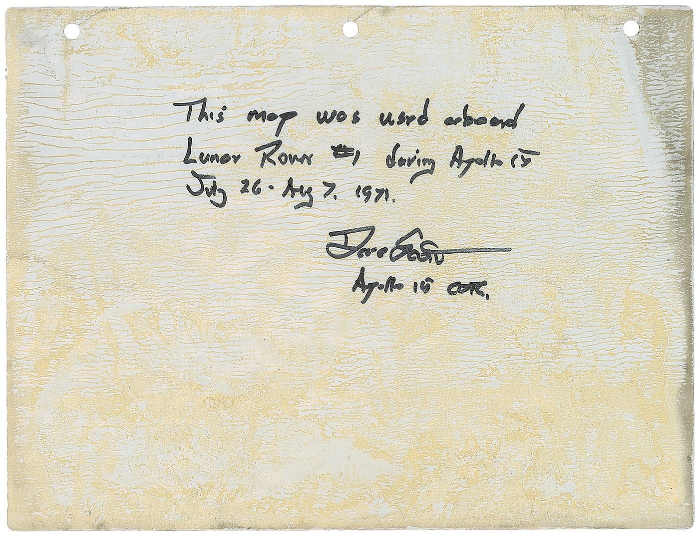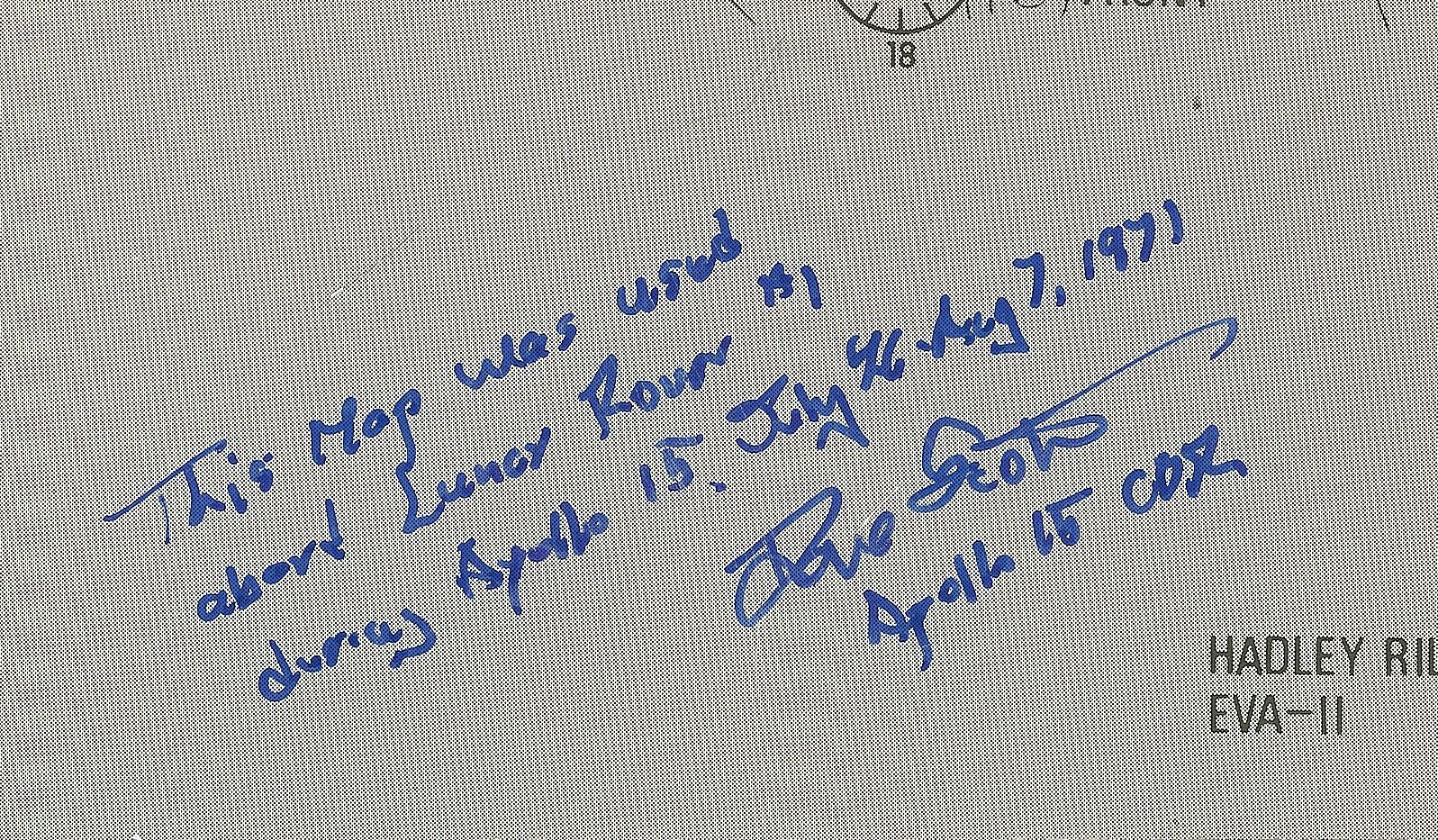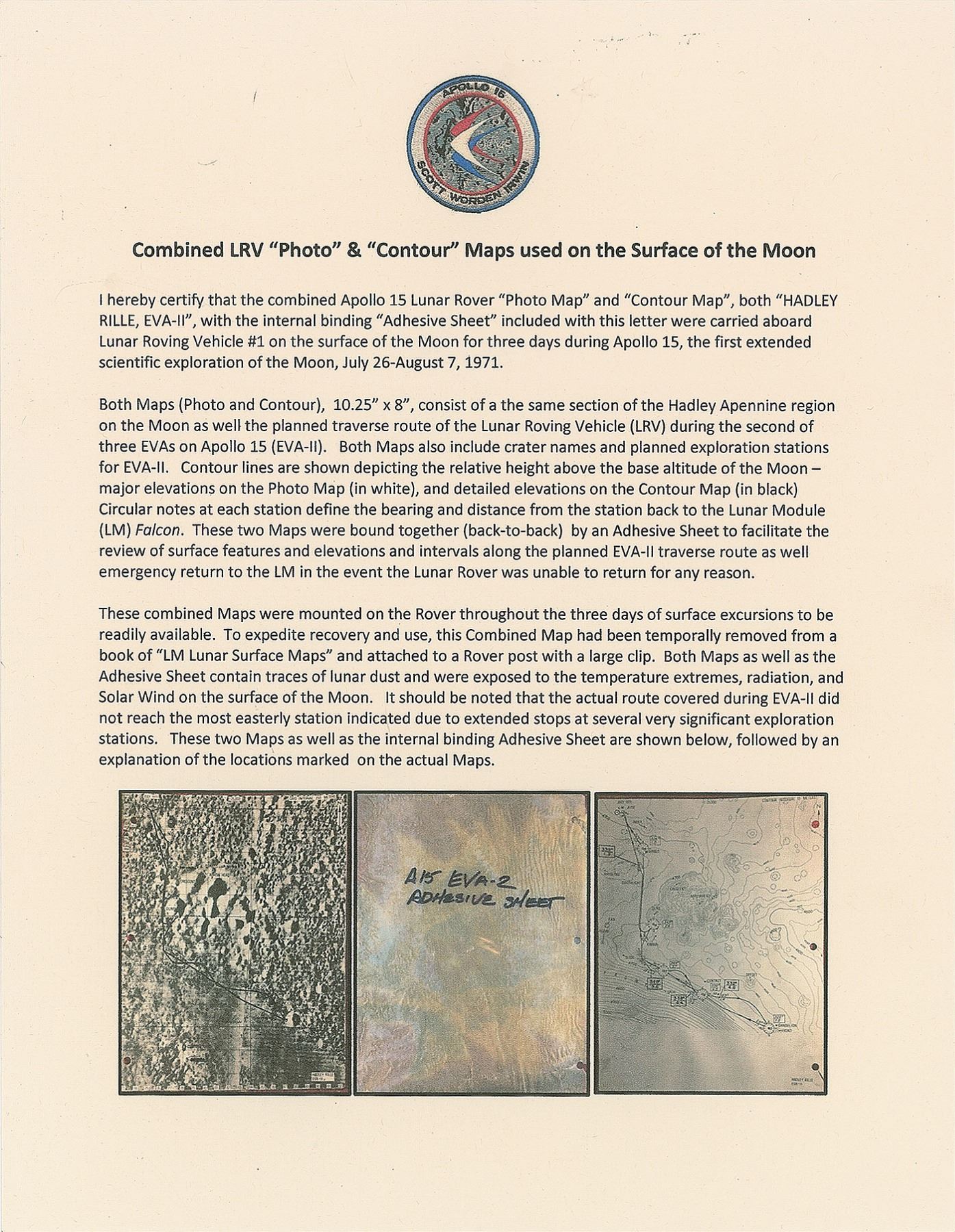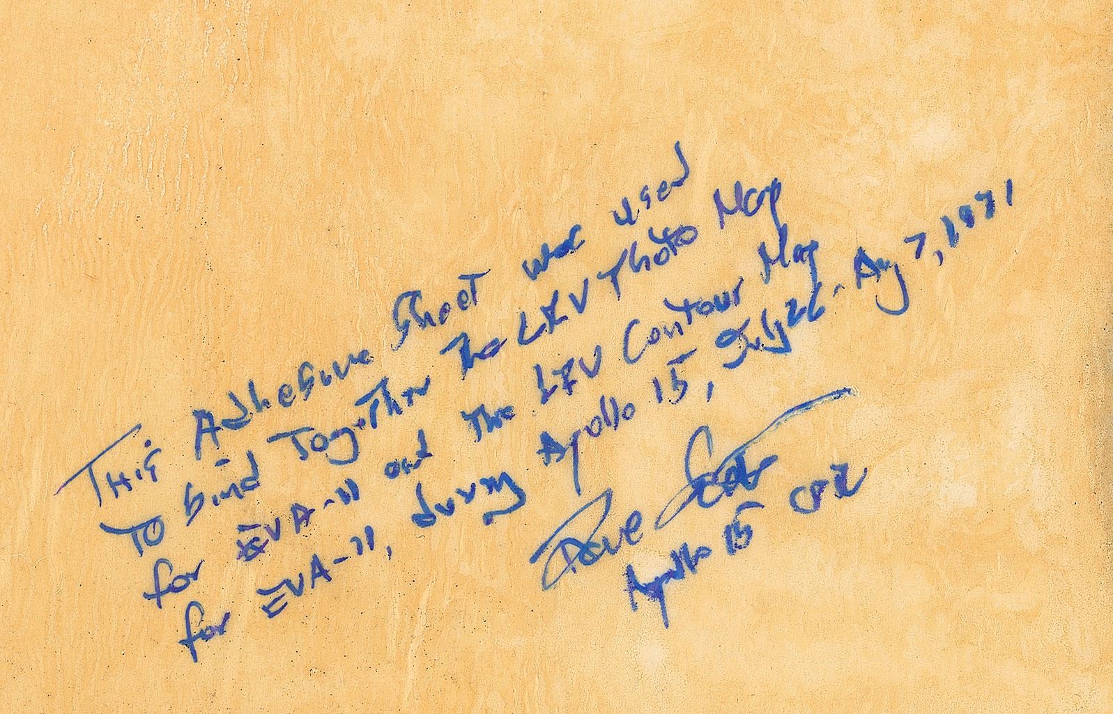 Dave Scott's incredible lunar flown Hadley Rille EVA II photo and contour maps carried aboard the Lunar Roving Vehicle 1 for three days of lunar surface exploration during the Apollo 15 mission. Both maps measure 8 x 10.5 and consist of the same 1:25,000 scale section of the Hadley Apennine region and the second planned traverse route of the LRV. Mission Commander Scott has signed and flight-certified the front and back to both maps in blue and black felt tip, "This map was used aboard Lunar Rover #1 during Apollo 15, July 26–Aug 7, 1971, Dave Scott, Apollo 15 CDR," and has circled and marked the location of the "Spur" crater on both maps. Also included is the original same-size adhesive sheet used to affix the maps back-to-back, which is also signed and flight-certified in blue felt tip, "This adhesive sheet was used to bind together the LRV Photo Map for EVA–II and the LRV Contour Map for EVA–II, during Apollo 15, July 26–Aug 7, 1971, Dave Scott, Apollo 15 CDR." Both maps include crater names and planned exploration stations for the EVA-II. Contour lines on both maps depict the relative height above the base altitude of the moon, with white lines on photo map showing major elevations, and black lines on contour map showing detailed elevations; circular notes at each station define the bearing and distance from the station back to the lunar module. The photo map also bears black ink notations by an unknown hand, which identifies various craters and craterlets such as: Domingo, Lightning, Blinky, Fifty One, Window, Tecumseh, Exuperay, and High. These maps were temporarily removed from a book of 'LM Lunar Surface Maps' and mounted to a rover post with a large clip for three days of surface excursions. Both maps, as well as the adhesive sheet, contain races of lunar dust and were exposed to the temperature extremes, radiation, and solar wind on the surface of the moon. In overall fine condition, with expected wear from use.