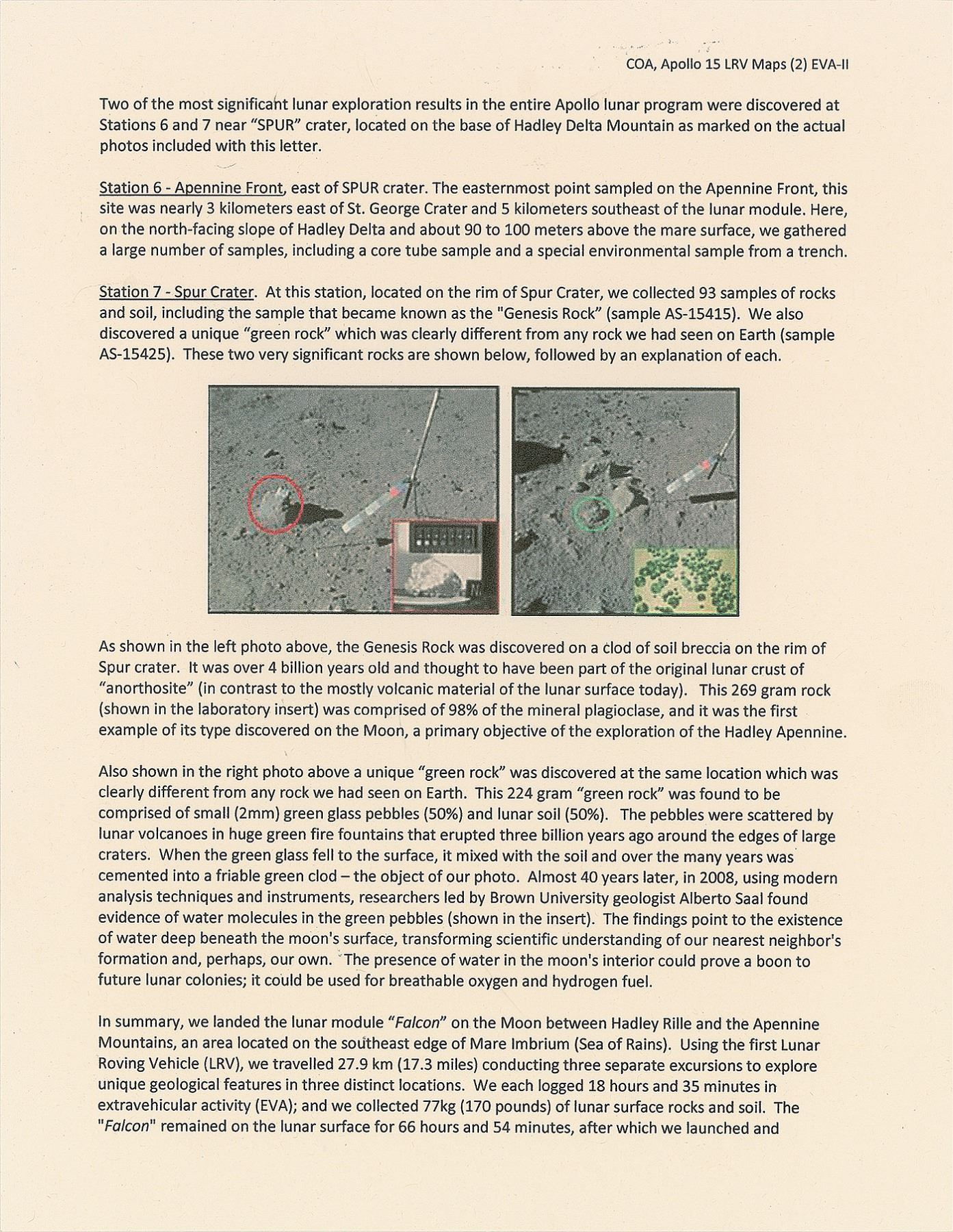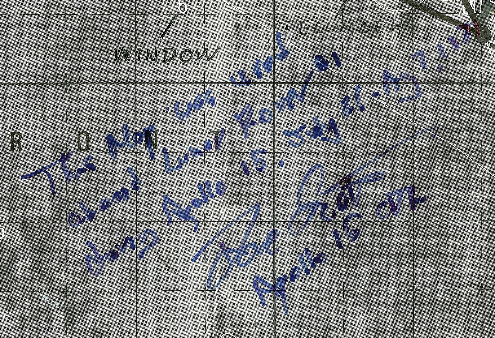 Accompanied by a signed letter of authenticity from Scott, in part: “I hereby certify that the combined Apollo 15 Lunar Rover 'Photo Map' and Contour Map,' both 'HADLEY RILLE, EVA–II,' with the internal binding 'Adhesive Sheet' included with this letter were carried aboard Lunar Roving Vehicle #1 on the surface of the Moon for three days during Apollo 15, the first extended scientific exploration of the Moon, July 26–August 7, 1971…As the mission commander of Apollo 15, I was in charge of the handling, use and dissemination of the Flight Data File, as such, these two LRV Maps (Photo and Contour) as well as the binding Adhesive Sheet have been in my personal collection since NASA presented it to me upon our return to Earth." Two of the most significant lunar exploration results in the entire Apollo lunar program were discovered during the second EVA of Apollo 15. CDR Scott and LMP Jim Irwin recovered huge amounts of soil samples at Station 6 (Apennine Front) and Station 7 (Spur Crater), the latter being the site of two utterly unique lunar finds: the ‘Genesis Rock,’ a large sample composed primarily of anorthite and formed in the early stages of the solar system, at least four billion years ago; and the 'green rock,' which, almost 40 years later, was discovered to contain water molecules, findings that pointed to the existence of water deep beneath the moon's surface. Truly, an unprecedented assemblage of navigation maps related to the historic second EVA of Apollo 15, the first mission to use the lunar rover. From the personal collection of Dave Scott.