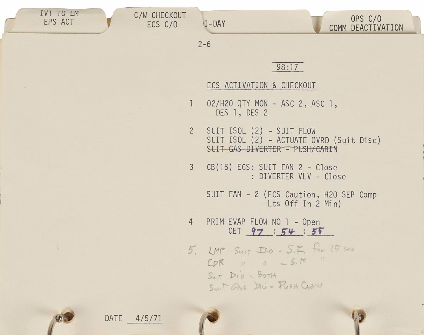 Dave Scott's ring-bound Lunar Module activation checklist used in lunar orbit and carried to the moon aboard the Lunar Module Falcon during Apollo 15, measures 6 x 8, 56 pages, signed and flight-certified on the front cover in blue felt tip, "Flown aboard the lunar module 'Falcon,' Apollo 15, July 26–Aug 7, 1971 (CDR Copy), Dave Scott, Apollo 15 CDR." The checklist is identified on the front cover with part number "SKB32100115–366" and serial number "1001," and is divided into two major sections: "TLC DAY [Translunar Coast Day]," during which the initial power-up of all systems verifies that the spacecraft has no major problems, and "PDI DAY [Powered Descent Initiation]," during which 35 specific steps are performed to prepare the LM for descent and landing. Several checklist pages feature pencil and ink notations made by Scott, consisting of various times and test and range numbers, as well as an additional step to page 2–6 under a section titled "ECS Activation & Checkout." In fine condition, with some marks to covers, interior pages remain clean.