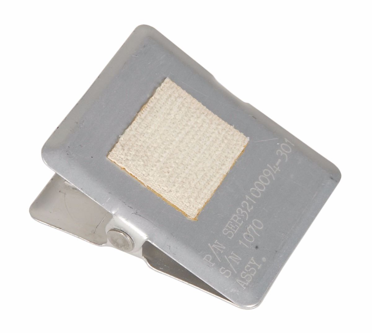 Dave Scott’s flown data file clip carried aboard the lunar module Falcon during the Apollo 15 mission, 1.75 x 2.25 x 1, with a swatch of Velcro affixed to bottom and engraved ID numbers, “P/N SEB32100094–301, S/N 1070, Assy.” Commander Scott used this clip to secure equipment such as checklist sheets, flight maps, and any loose articles; it was most frequently used to keep his checklist book open to the right page during the crew’s 12-day mission to the moon back. In fine condition, with expected wear. Accompanied by a signed letter of authenticity from Scott, in part: “I hereby certify that the Apollo 15 Data File Clip included with this letter was used aboard the Lunar Module Falcon on the surface of the moon for 3 days during Apollo 15…This particular Data File Clip is identified in the Apollo 15 ‘LM Lunar Launch Stowage List,’ page 78. The traces of dark material in the velcro are most likely lunar dust from our space suits or other equipment…This Data File Clip has been in my personal collection since returning to earth.” A decidedly appealing and uncommon piece used extensively during the flight of Apollo 15, the first extended scientific exploration of the Moon.