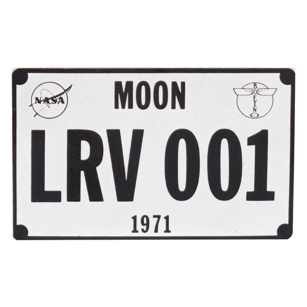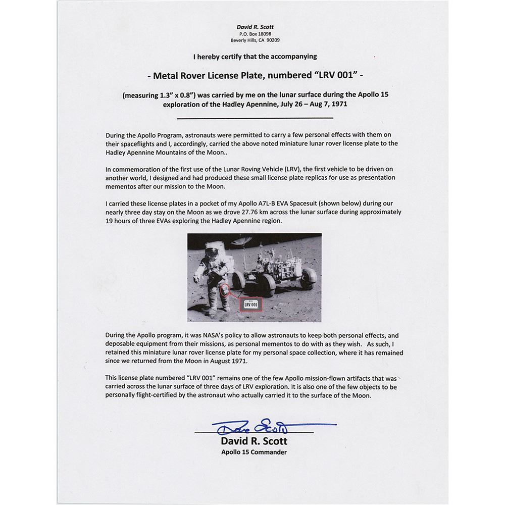 Flown miniature aluminum 'lunar rover license plate' carried to the lunar surface on Apollo 15, measuring approximately 1.25è x .75è, marked with the registration number "LRV 001," with "MOON" as the home state, the year 1971, and the NASA and Boeing logos in the corners. Astronaut Dave Scott carried this in his A7L-B space suit pocket on all three lunar EVAs, including on the lunar rover. In fine condition. Accompanied by a detailed letter of provenance signed by Apollo 15 Commander Dave Scott, in part: "I hereby certify that the accompanying Metal Rover License Plate, numbered 'LRV 001'‰Û_was carried by me on the lunar surface during the Apollo 15 exploration of the Hadley Apennine, July 6‰ÛÒAugust 7, 1971‰Û_In commemoration of the first use of the Lunar Roving Vehicle (LRV), the first vehicle to be driven on another world, I designed and had produced these small license plate replicas for use as presentation mementos after our mission to the Moon."
