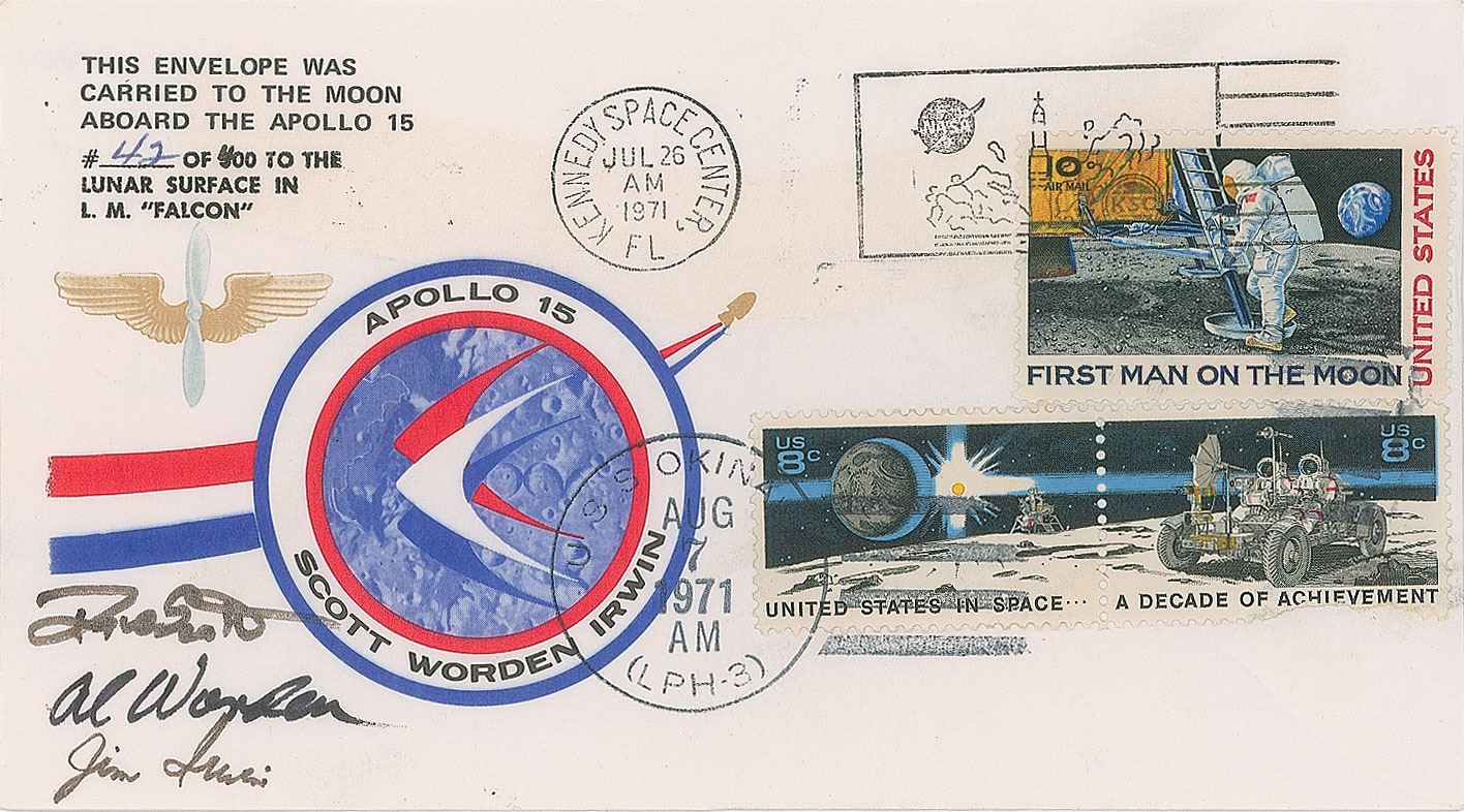 Included with the cover is a one-page typed notarized certification, signed “Alfred M. Worden,” “David R. Scott,” and “James B. Irwin,” dated July 19, 1983, reading, in part: “Postal covers were carried aboard the Apollo 15 Mission, which postal covers were stamped and postmarked at Kennedy Space Center, Florida, on the date of the launch, July 26, 1971, and carried aboard the Apollo 15 Spacecraft during the entire term of the Mission, to include landing on the moon, and were returned to the Earth at the termination of the Mission on August 7, 1971…The postal covers were in the possession of one or more of the undersigned until 1972, at which time they were deposited with the United States Government…The undersigned have this date inspected Postal Cover No. 42, bearing NASA Serial No. 059, and aver, affirm and certify that said Postal Cover is a cover which was carried aboard the United States Lunar Mission—Apollo 15.” All three crew members have also added their initials to a small correction in the text. In fine condition.
