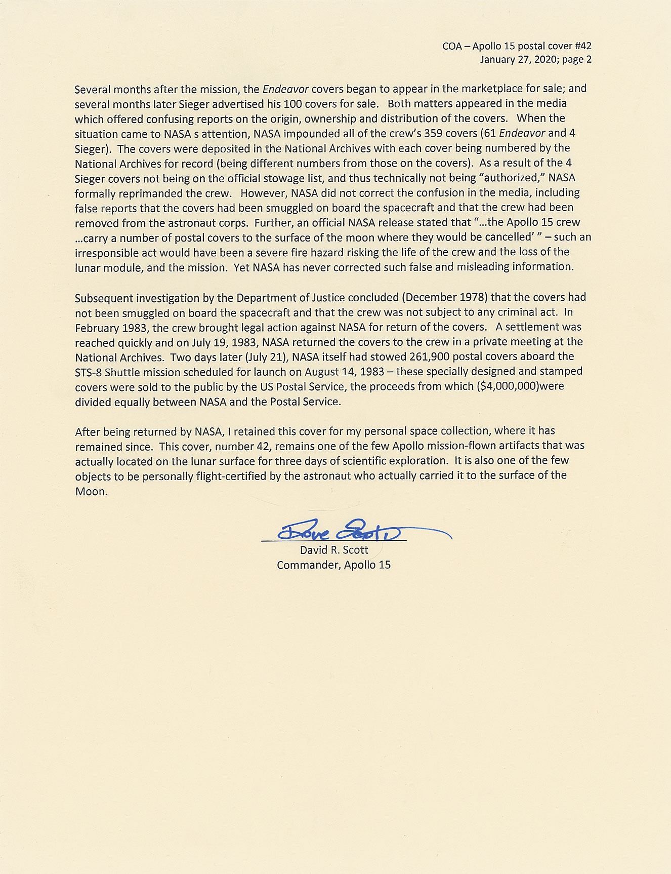 Accompanied by a lengthy signed letter of provenance from Cdr. Scott, which reads, in part: “I hereby certify that the post cover No. 22 included with this letter was carried to the lunar surface aboard the Lunar Module Falcon during the three-day Apollo 15 extended scientific exploration of the Hadley Apennine region of the Moon, July 26–August 7, 1971…As was common practice on Apollo missions, postal covers and medallions were carried aboard the spacecraft as mementoes. Because of the increased mass of equipment to be carried by the Apollo 15 lunar module (including the Lunar Rover), I was informed by my supervisor, Donald Slayton, that only half the number of medallions previously carried would be allowed on Apollo 15.
