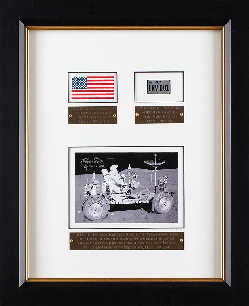 The miniature metal Lunar Rover license plate, 'LRV 001'…was carried on Apollo Lunar Roving Vehicle (LRV) No. 1 for three days of surface exploration…In commemoration of the first use of the Lunar Roving Vehicle (LRV), the first vehicle to be driven on another world, I designed and had produced this small LRV-001 license plate for use as a presentation memento after our mission to the Moon. This license plate was carried in a pocket of my Apollo A7L-B EVA Spacesuit as we drove 'LRV-001' 27.76 km across the Hadley Apennine region of the Moon during approximately 19 hours of three lunar surface EVAs…This small OPS flag and this Lunar Rover #1 license plate have been in my personal collection since we returned from the Moon." An absolutely magnificent limited edition display boasting two historic flown artifacts.