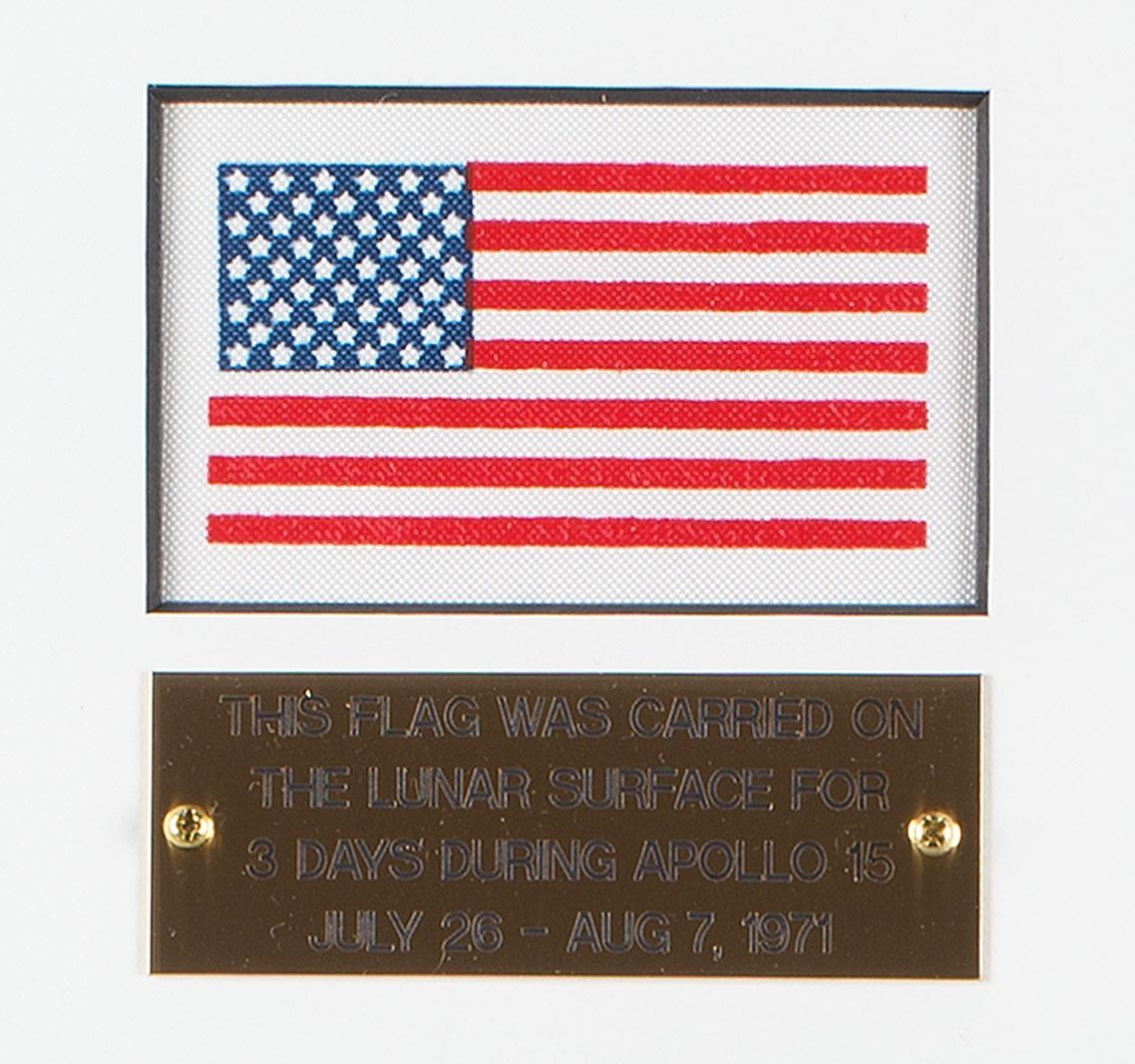 Accompanied by a signed letter of provenance from Scott, also numbered 4/10, describing in detail the history of each piece. In part: "I hereby certify that the small beta-cloth US flag…was carried inside a beta-cloth package mounted on an internal structural bracket of an Apollo 15 Oxygen Purge System (OPS) for three days of EVA excursions during Apollo 15, the first extended exploration of the Moon, July 26–August 7, 1971. The OPS, including this small beta cloth US flag, was attached to the top of the Portable Life Support System (PLSS) on the lunar surface such that in the event of a PLSS failure, the OPS flow provides 30 minutes of breathing oxygen to the crewman…Several weeks after Apollo 15, this OPS Bracket and Flag Package were shown to me by NASA senior management. According to management, a member of the JSC Crew Systems Division (CSD) had prepared the flags and secretly stowed them…I was given the OPS bracket and package of flags…