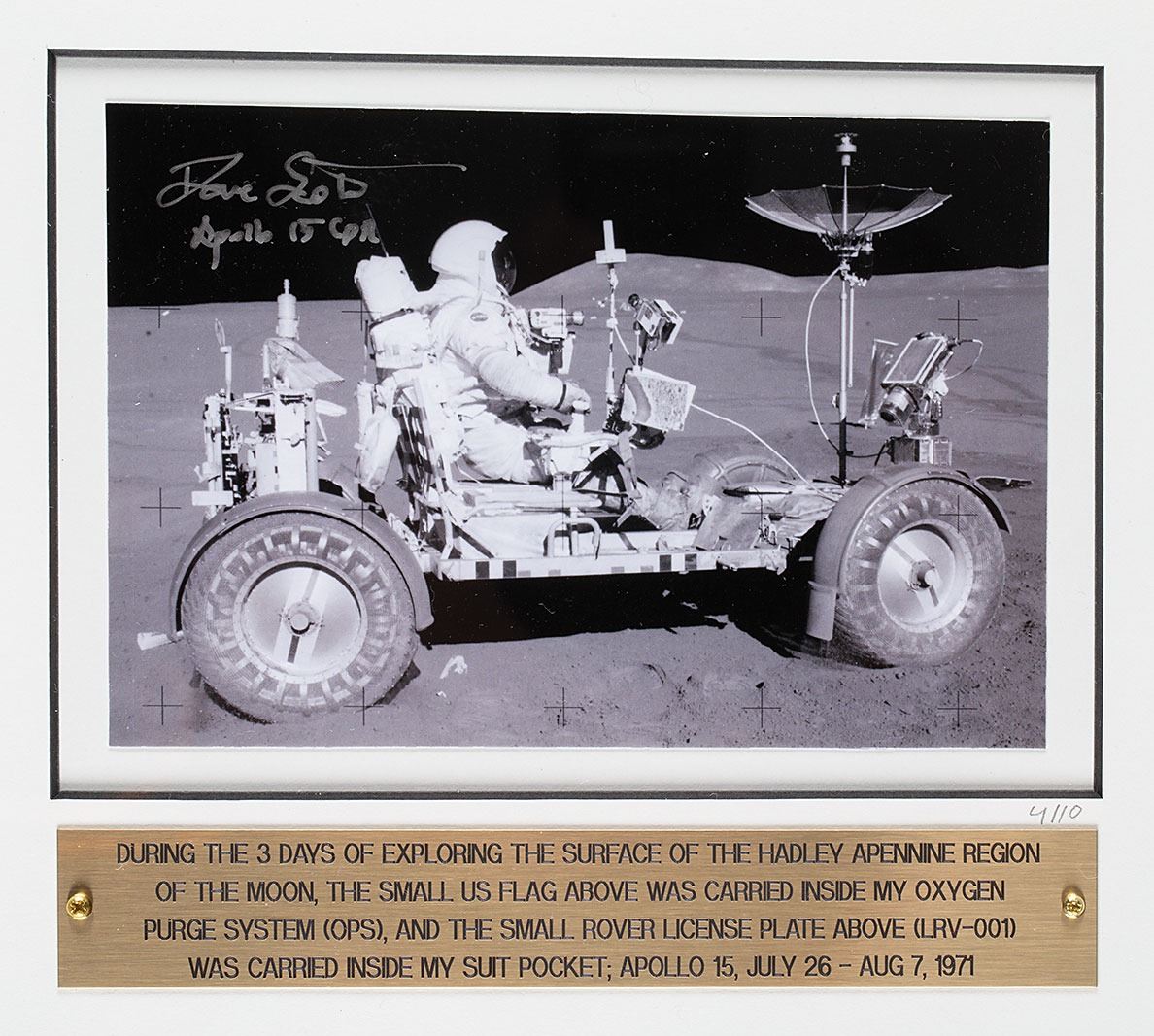 Extraordinary limited edition flown flag and lunar rover license plate display, numbered 4/10, featuring a small 2.75 x 1.5 Beta cloth American flag and miniature 1.3 x .8 LRV license plate, both carried on the lunar surface for three days by Commander Dave Scott during Apollo 15. Displayed with a satin-finish 5.75 x 4 photo of Scott on the LRV, signed in silver ink, "Dave Scott, Apollo 15 CDR." The three are archivally matted and framed together with descriptive plaques to an overall size of 13.75 x 16.75. In fine condition. From the personal collection of Dave Scott.