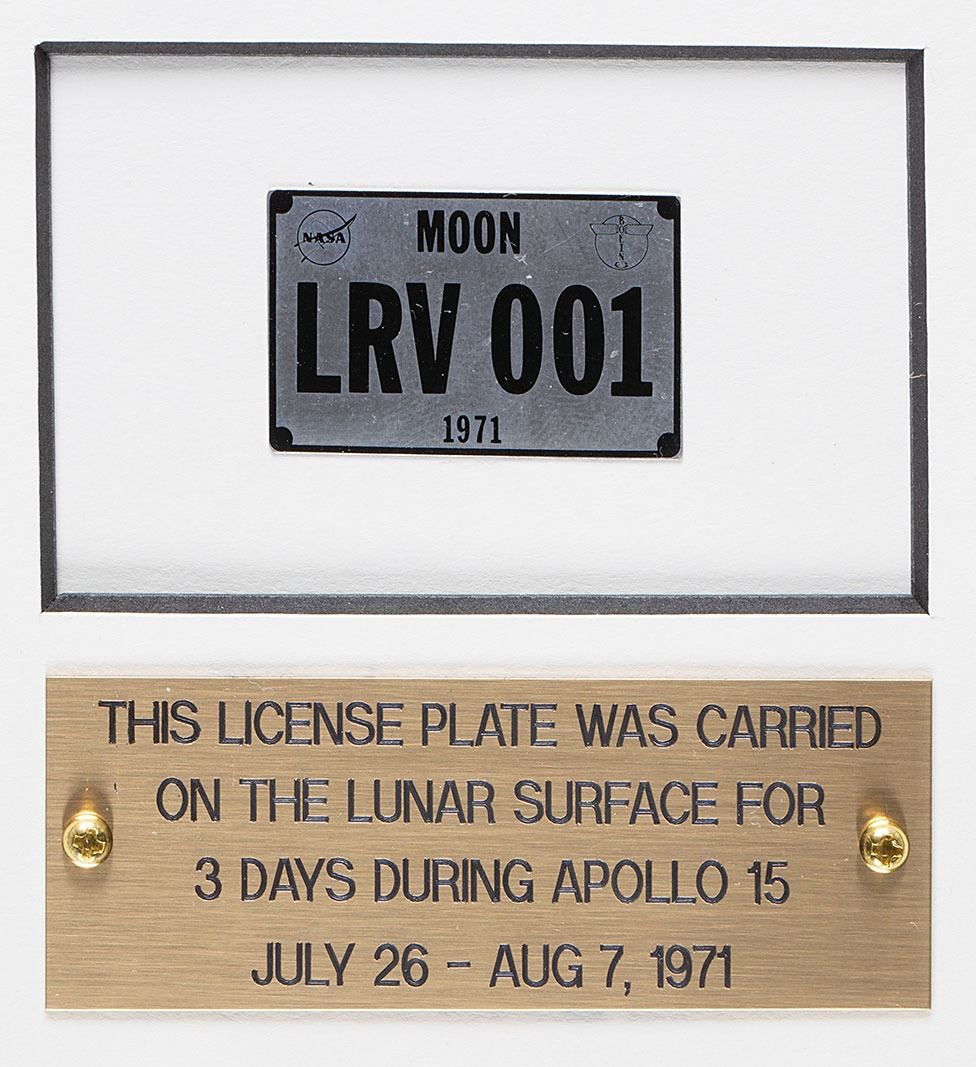 The miniature metal Lunar Rover license plate, 'LRV 001'…was carried on Apollo Lunar Roving Vehicle (LRV) No. 1 for three days of surface exploration…In commemoration of the first use of the Lunar Roving Vehicle (LRV), the first vehicle to be driven on another world, I designed and had produced this small LRV-001 license plate for use as a presentation memento after our mission to the Moon. This license plate was carried in a pocket of my Apollo A7L-B EVA Spacesuit as we drove 'LRV-001' 27.76 km across the Hadley Apennine region of the Moon during approximately 19 hours of three lunar surface EVAs…This small OPS flag and this Lunar Rover #1 license plate have been in my personal collection since we returned from the Moon." An absolutely magnificent limited edition display boasting two historic flown artifacts.
