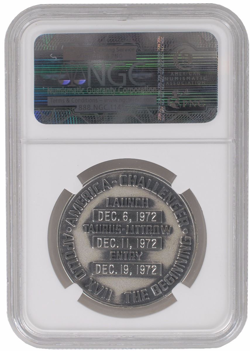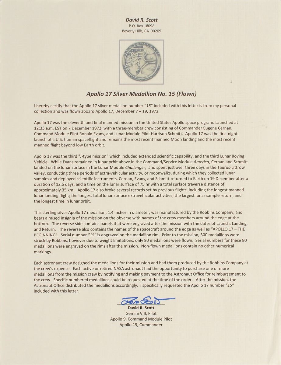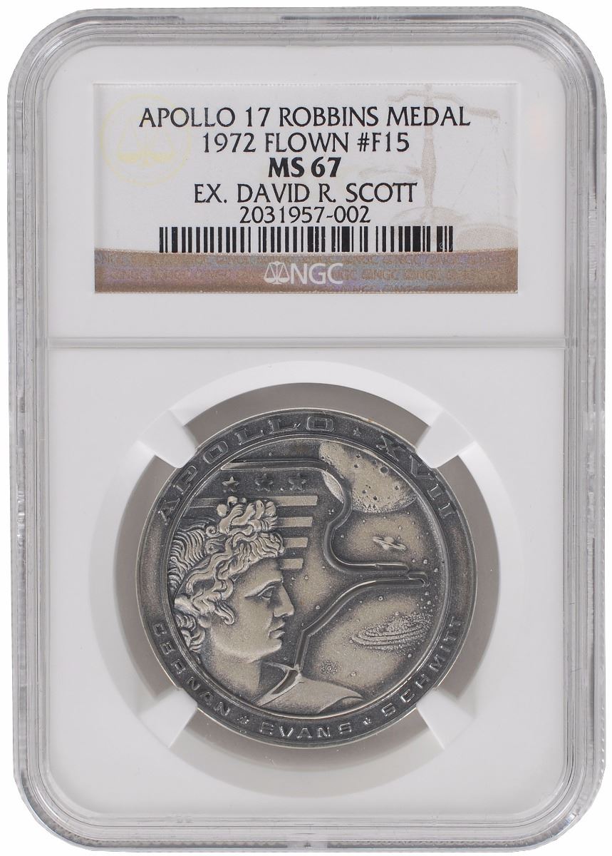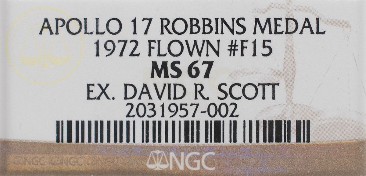 Dave Scott’s flown Apollo 17 Robbins medal, approximately 1.25? in diameter, with a raised design on the face featuring the mission insignia. The reverse is encircled with raised text, “America–Challenger, Apollo XVII, The Beginning,” and is engraved with the launch date of December 6, 1972, the moon landing date of December 11, 1972, and the reentry date of December 19, 1972. The medal is serial numbered “15” on the rim, and encapsulated in a plastic NGC holder and graded MS67, noting that it originates from the collection of David R. Scott. Condition is mint state. Accompanied by a signed letter of provenance from Scott stating, in part, “I hereby certify that the Apollo 17 silver medallion ‘15’ included with this letter is from my personal collection and was flown aboard Apollo 17…the eleventh and final manned mission in the United States Apollo space program…Prior to the mission, 300 medallions were struck by Robbins, however due to weight limitations, only 80 medallions were flown. Serial numbers for these 80 medallions were engraved on the rims after the mission…I specifically requested the Apollo 17 number ‘15’ included with this letter.” One of the most sought-after and difficult-to-obtain of all the Apollo flown medals, this example is further enhanced by its grade of MS67, the highest rating ever assigned.