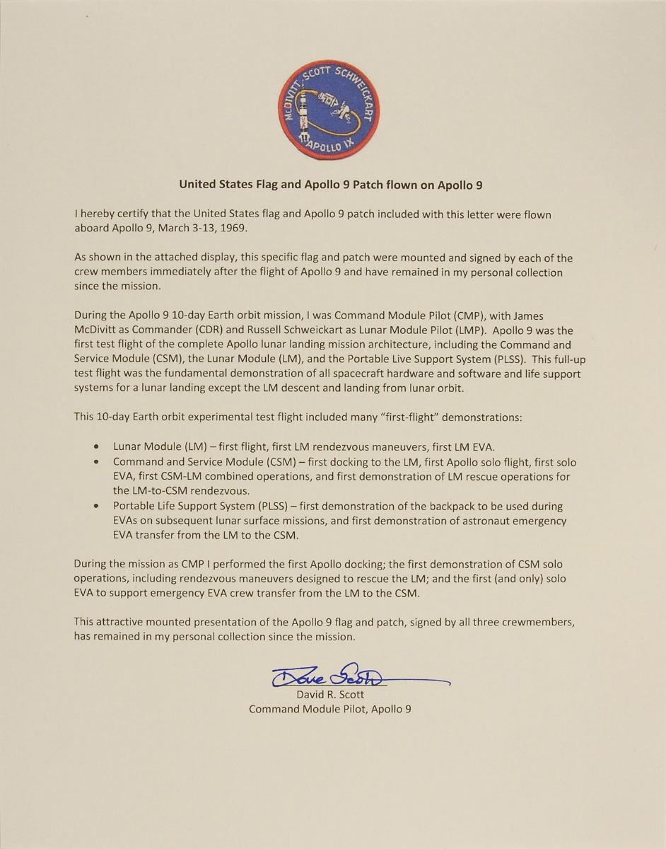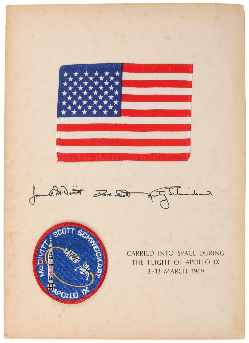 Flown 6 x 4 American flag and 3.25? diameter mission patch carried on board the Apollo 9 mission, affixed to an 11 x 14 presentation certificate, signed in black tip, “James A. McDivitt,” “Dave Scott,” and “Rusty Schweickart,” with an Apollo 9 mission patch affixed to lower left. Printed text on the certificate reads: “Carried into space during the flight of Apollo IX, 3–13 March 1969.” Mounted to a same-size piece of cardstock. In very good to fine condition, with foxing and crease to upper right corner of mount; flag and path themselves remain in fine condition. Accompanied by a signed letter of authenticity from Scott, in part: “I hereby certify that the United States flag and Apollo 9 patch included with this letter were flown aboard Apollo 9, March 3–13, 1969...This specific flag and patch were mounted and signed by each of the crew members immediately after the flight of Apollo 9 and have remained in my personal collection since the mission.”