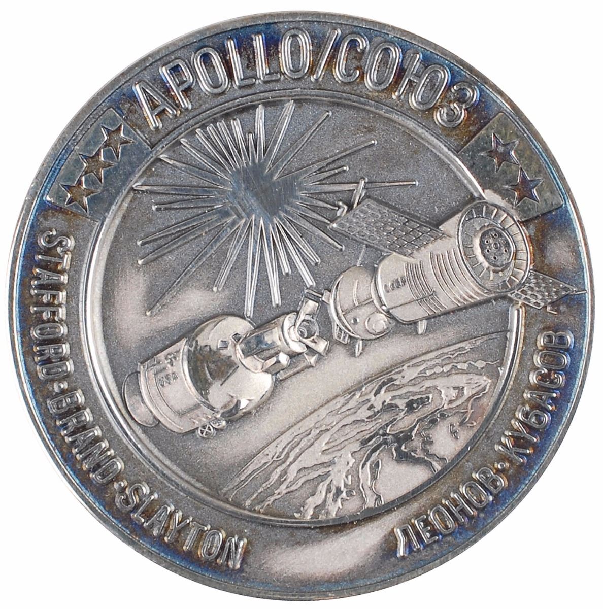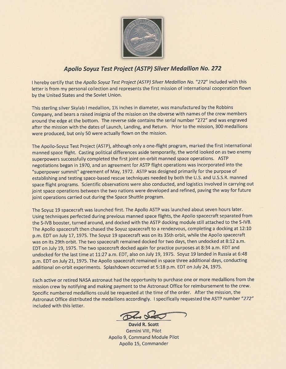 Unflown sterling silver Apollo-Soyuz Robbins Medal, approximately 1.25? in diameter, with a raised design on the face of the mission insignia, and the mission and astronauts’ names in both English and Cyrillic. The reverse is engraved with the launch and entry dates, as well as “First Joint U.S.-U.S.S.R. Space Flight.” Medal is serial numbered on the rim, “272,” and includes its original matching case. Condition is mint state, with some toning to rim and inscription field. Accompanied by a signed letter of provenance from Dave Scott, in part: “I hereby certify that the Apollo Suyoz Test Project (ASTP) Silver Medallion No. ‘272’ included with this letter is from my personal collection and represents the first mission of international cooperation flown by the United States and the Soviet Union...I specifically requested the ASTP number ‘272’ included with this letter.”