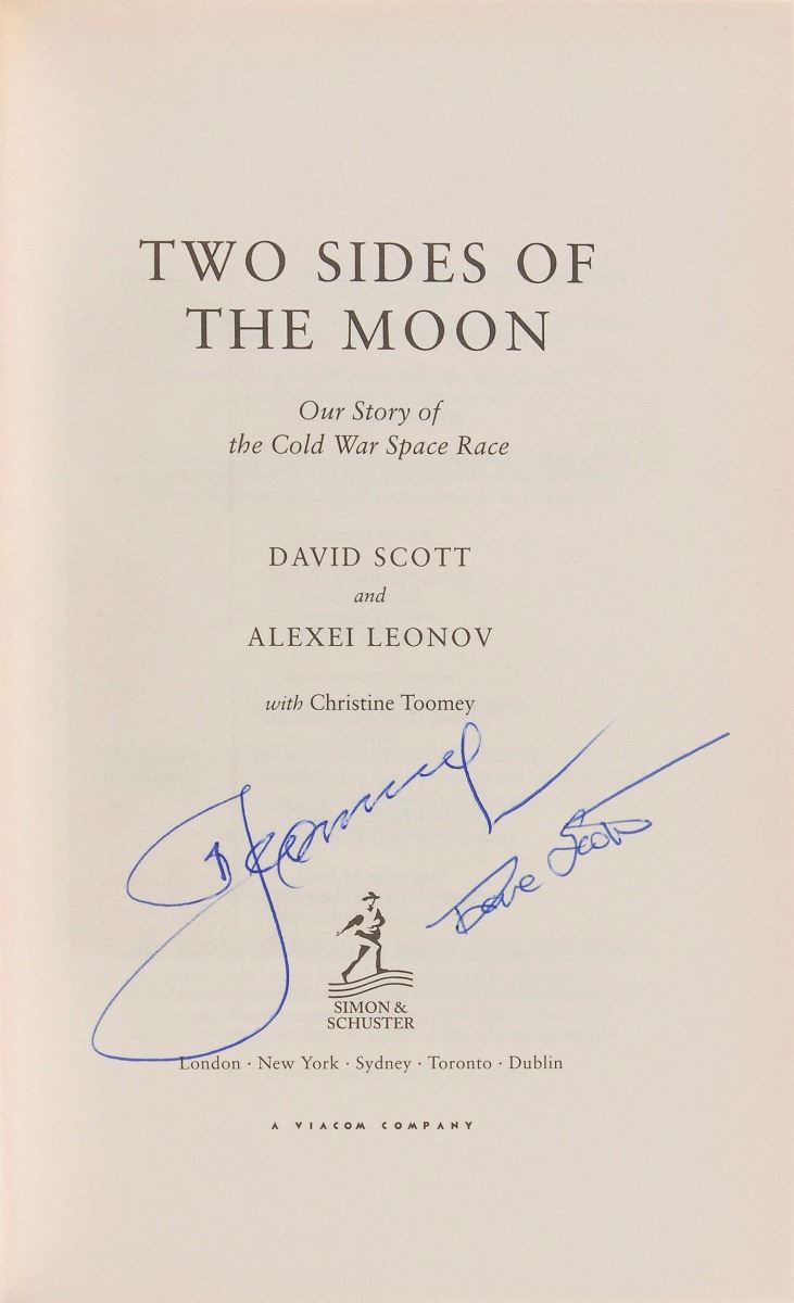 Signed book: Two Sides of the Moon. First British edition. London: Simon & Schuster, 2004. Hardcover with dust jacket, 5.75 x 8.75, 415 pages. Signed on the title page in blue ballpoint by Dave Scott and Alexei Leonov. In fine condition.