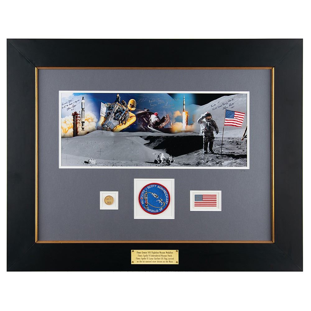 Magnificent limited edition display of three flown artifacts from the personal collection of legendary NASA moonwalker Dave Scott, whose storied astronautical career is fully represented with this beautiful framed display, which is numbered 2 of 10. The items include: a 1Ë gold-plated Fliteline medallion carried during the Gemini 8 mission; a 3.5Ë embroidered Apollo 9 insignia patch carried into Earth’s orbit during the 10-day mission; and a 2.75Ë x 1.75Ë Beta cloth American flag that was carried to the surface of the moon during the Apollo 15 mission. These three items are matted together with a color panoramic photo of images from each mission that is signed three times by Scott in silver ink or black felt tip: “Gemini VIII, First to dock in space, Dave Scott, PLT,†“Apollo 9, Lunar Module First Flight, Dave Scott, LMP,†and “Apollo 15, First Lunar Roving Vehicle, Dave Scott, CDR.†Archivally framed with an engraved plaque to an overall size of 31.25 x 24.75. In overall very fine condition. Accompanied by a letter of authenticity from Scott, who attests to the flown status of each item and signs in blue ink below each of the three detailed item descriptions. Additionally, Scott notes that the reverse of the patch is signed and flight-certified, “A-9 Flown, D,†and that the flag “was carried inside a beta-cloth package mounted on an internal structural bracket of an Apollo 15 Oxygen Purge System (OPS) used for three days of EVA excursions during Apollo 15.â€
