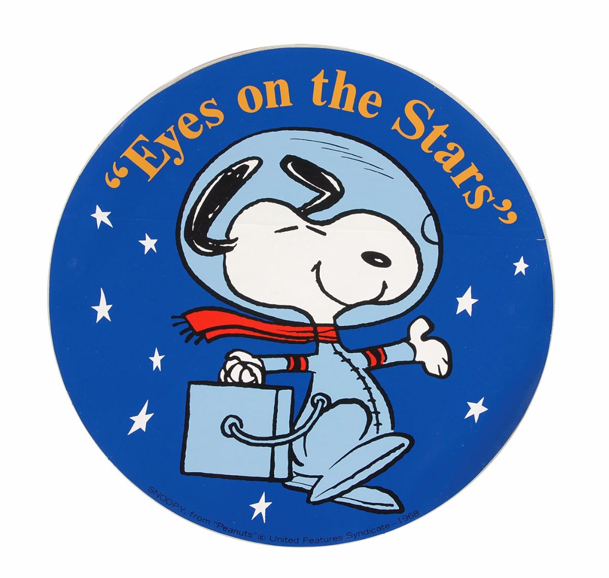 Large Snoopy decal from 1968 used for the Manned Space Flight Awareness Program, 10? in diameter, showing Charlie Brown’s beloved pup skipping in an astronaut suit, with the text above, “‘Eyes on the Stars.’” In fine condition.