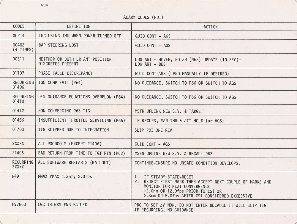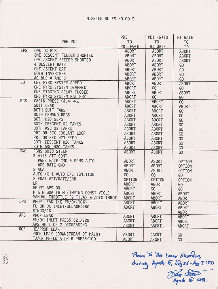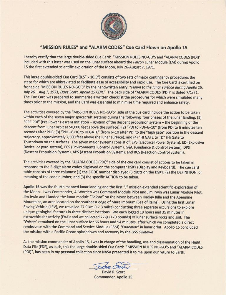 Flown large double-sided "Mission Rules No-Go's" cue card carried to the lunar surface on Apollo 15, 8 x 10.5, signed and flight-certified in blue felt tip, "Flown to the lunar surface, during Apollo 15, July 26–Aug 7, 1971, Dave Scott, Apollo 15 CDR." The front lists a series of "Pre PDI" potential no-go situations, and the reverse lists alarm codes with definitions and actions. In fine condition. Accompanied by a signed letter of provenance from Scott, in part: "I hereby certify that the large double-sided Cue Card: 'Mission Rules No-Go's' and 'Alarm Codes (PDI)' included with this letter was used on the lunar surface aboard the Falcon Lunar Module (LM) during Apollo 15...This large double-sided Cue Card...consists of two sets of major contingency procedures the steps for which are abbreviated to facilitate ease of accessibility and rapid use...The Cue Card was prepared to summarize a written checklist the procedures for which were simulated many times prior to the mission, and the Card was essential to minimize time required and enhance safety. The activities covered by the 'Mission Rules No-Go's' side of the cue card include the action to be taken within each of the seven major spacecraft systems during the following four phases of the lunar landing: (1) 'Pre PDI' (Pre Power Descent Initiation—ignition of the descent propulsion system—the beginning of the descent from lunar orbit at 50,000 feet above the surface); (2) 'PDI to PDI+6+10' (from PDI to 6 minutes ten seconds after PDI); (3) 'PDI+6+10 to Hi Gate' (from 6+10 after PDI to the 'high gate' position in the descent trajectory, approximately 7,500 feet above the lunar surface); and (4) 'Hi Gate to TD' (Hi Gate to Touchdown on the surface). The seven major systems consist of EPS (Electrical Power System), ED (Explosive Devise, or pyro system), ECS (Environmental Control System), G&C (Guidance & Control System), DPS (Descent Propulsion System), APS (Ascent Propulsion System), and RCS (Reaction Control System). The activities covered by the 'Alarm Codes (PDI)' side of the cue card consist of actions to be taken in response to the 5-digit alarm codes displayed on the computer DSKY (Display and Keyboard). The cue card table consists of three columns: (1) the CODE number displayed (5 digits on the DSKY); (2) the DEFINITION, or meaning of the code number; and (3) the specific ACTION to be taken." A superb mission-critical, lunar-flown cue card from Apollo 15, the first extended scientific exploration of the moon.