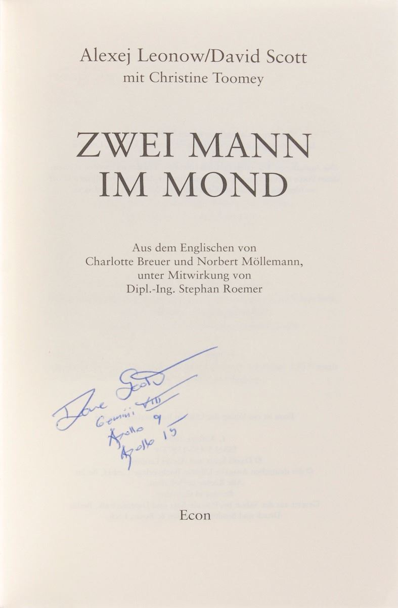 Signed book: Zwei Mann in Mond [Two Sides of the Moon]. Berlin: Econ, 2004. Hardcover with dust jacket, 5.75 x 8.75, 464 pages. Signed on the title page in blue ballpoint, “Dave Scott, Gemini VIII, Apollo 9, Apollo 15.” In fine condition, with bumped corners.