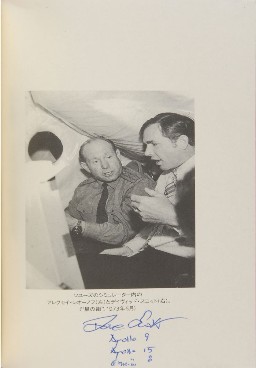 Signed book: Two Sides of the Moon [Japanese Edition]. Tokyo: Sony Magazines, 2005. Hardcover with dust jacket, 5.25 x 7.5, 541 pages. Signed on the frontispiece in blue ballpoint, “Dave Scott, Apollo 9, Apollo 15, Gemini 8.” In fine condition.