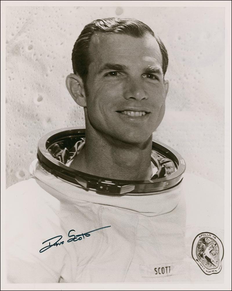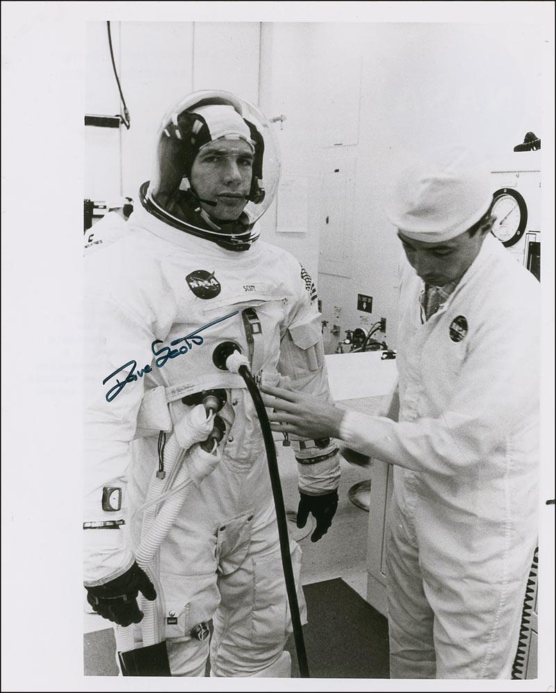 Two glossy 8 x 10 NASA photos of Scott in his spacesuit, each signed in black felt tip. In very good condition, with scattered creasing and surface marks.