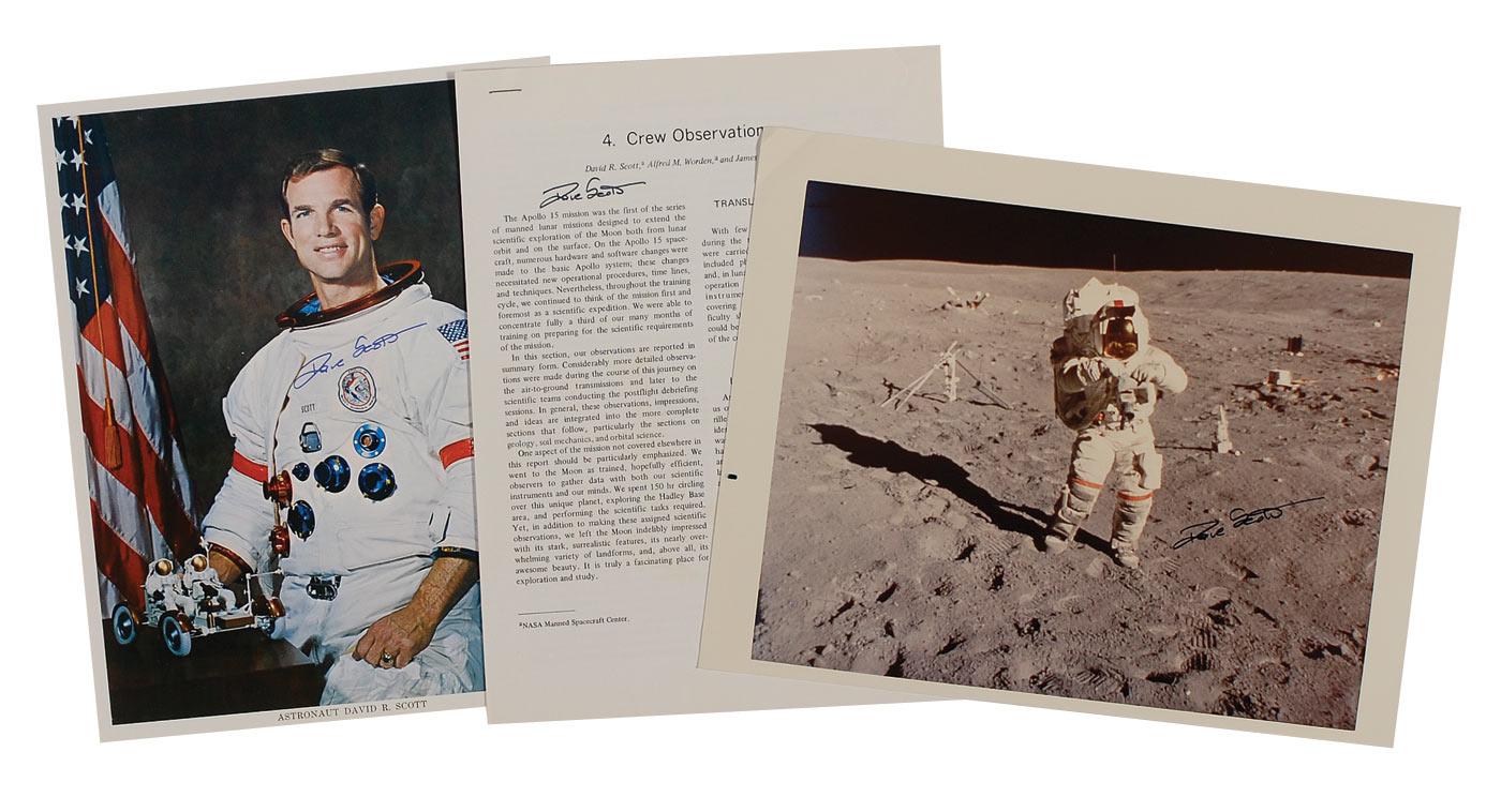 Three items: one color NASA 8 x 10 photo of Dave Scott posing in his spacesuit, signed in blue felt tip, “Dave Scott”; one color 11 x 8.5 photo of Scott performing a moonwalk, signed in black felt tip; and 7.5 x 10 Apollo 15 Preliminary Science Report, signed on the front cover in black felt tip. In overall fine condition, with some mild border and corner creasing to all three items.