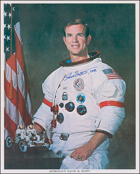 Color 8 x 10 NASA photo of Scott in his space suit posing with a model of a lunar rover, signed in blue felt tip “Dave Scott, CDR.” In fine condition.