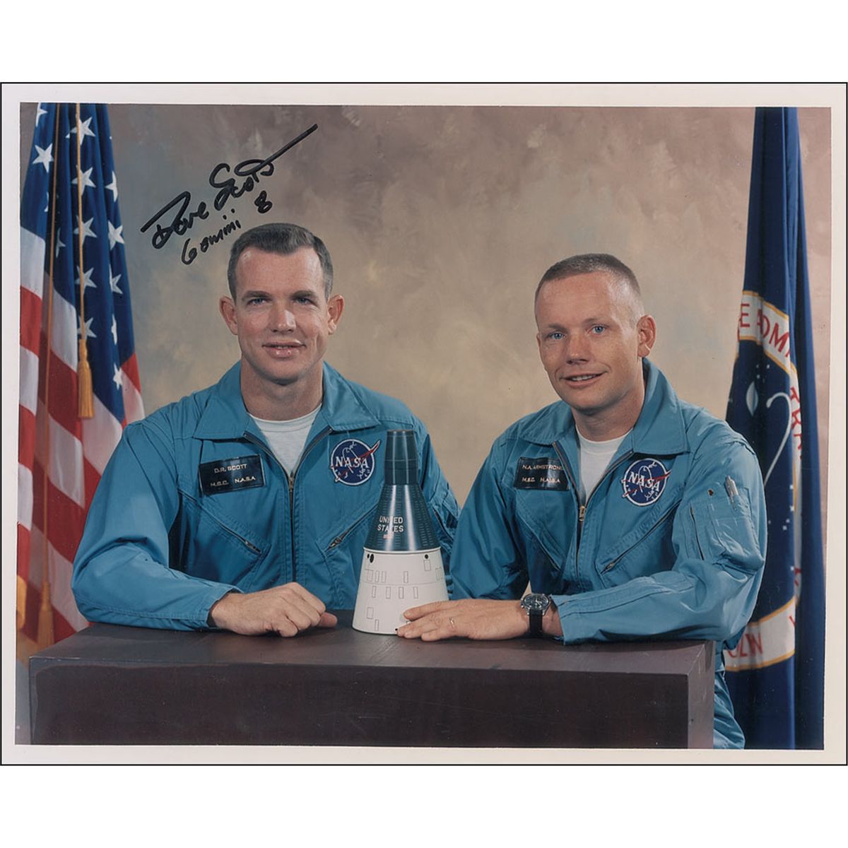 Color satin-finish 10 x 8 photo of Scott posing with his Gemini 8 crewmate Neil Armstrong, signed in black felt tip, “Dave Scott, Gemini 8.” In very fine condition.
