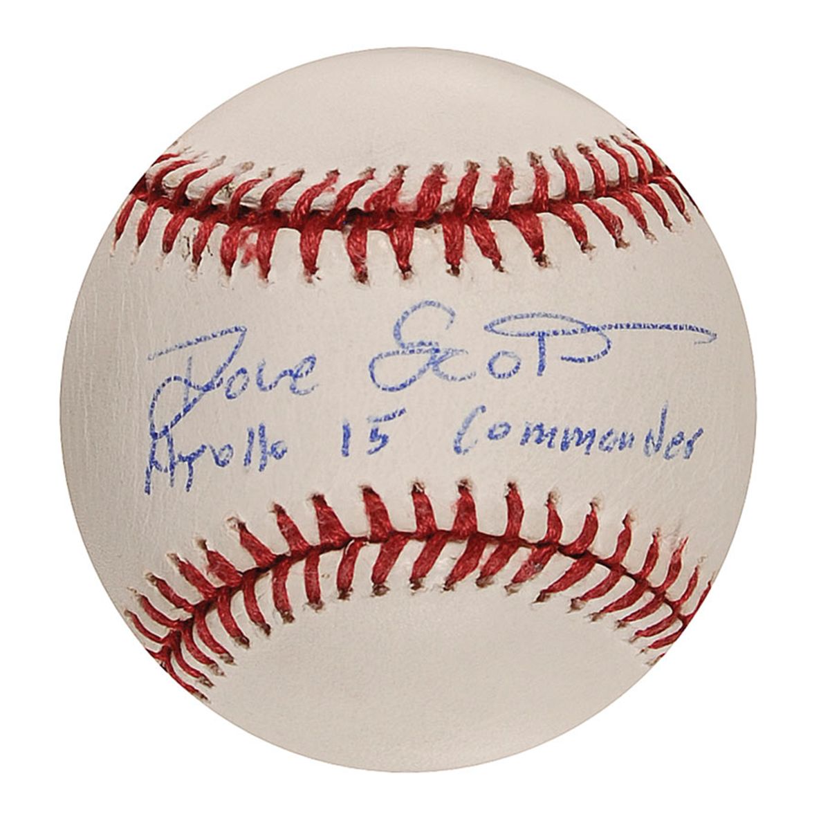 Official Rawlings Major League baseball signed in blue ballpoint on the sweet spot, “Dave Scott, Apollo 15 Commander.” In fine condition, with some light wrinkling to the ball’s white covering.
