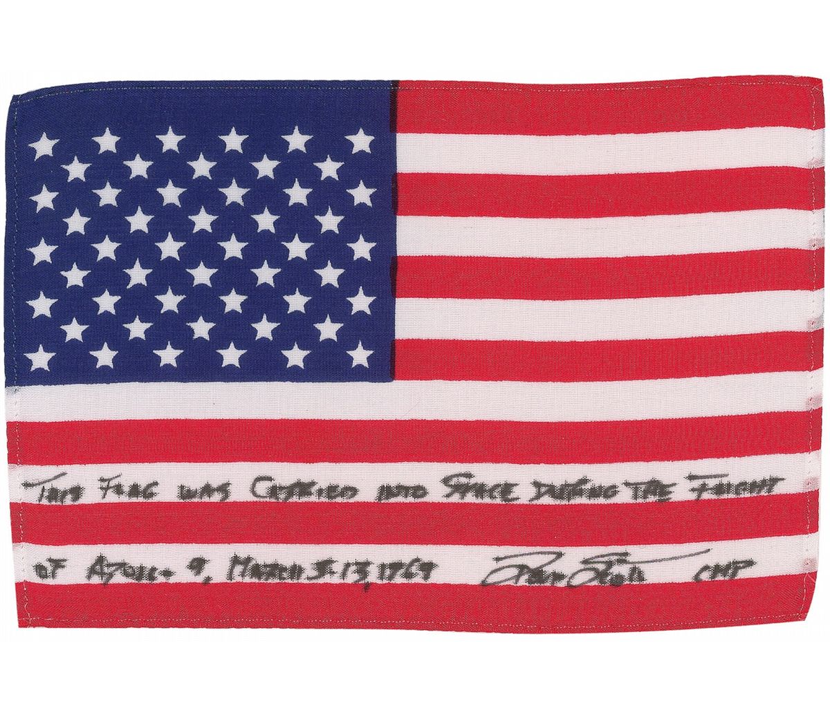Flown printed fabric American flag, 6 x 4, flown aboard Apollo 9 to the moon, signed in black felt tip, “This flag was carried into space during the flight of Apollo 9, March 3–13, 1969, Dave Scott CMP.” Flag is sewn by its horizontal edges to an 8 x 6 padded board. Expected light overall feathering to signature and certification, otherwise fine condition.