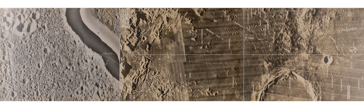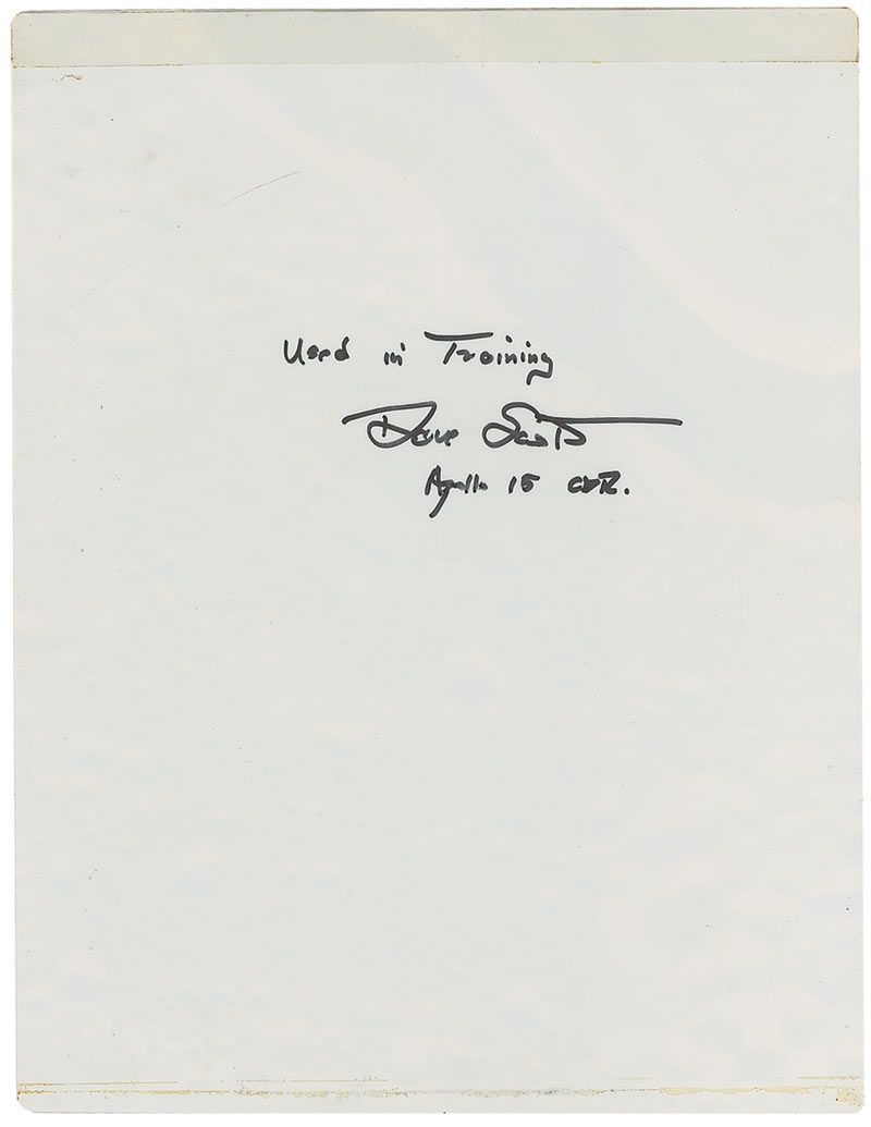 Apollo 15 training lunar descent map used in preparation for the Apollo 15 mission. Map is comprised of three taped together sections for an overall size of 8 x 31, with the middle panel labeled “Ascent Monitor Chart, Apollo 15, July 26, 1971,” with all landmarks identified, including “Marsh of Decay,” “Arrowhead,” several “Archimedes,” and “Hadley Rille.” Signed on the reverse, “Used in training, Dave Scott, Apollo 15 CDR.” In fine condition, with old tape connection sections and a bit of scattered light silvering.