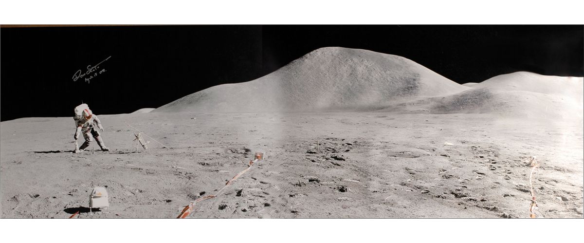 Enormous panoramic color 60 x 24 photo of Scott performing an experiment on the lunar surface, signed in silver ink, “Dave Scott, Apollo 15 Cdr.” Rolled and in fine condition, with a few scattered surface marks.