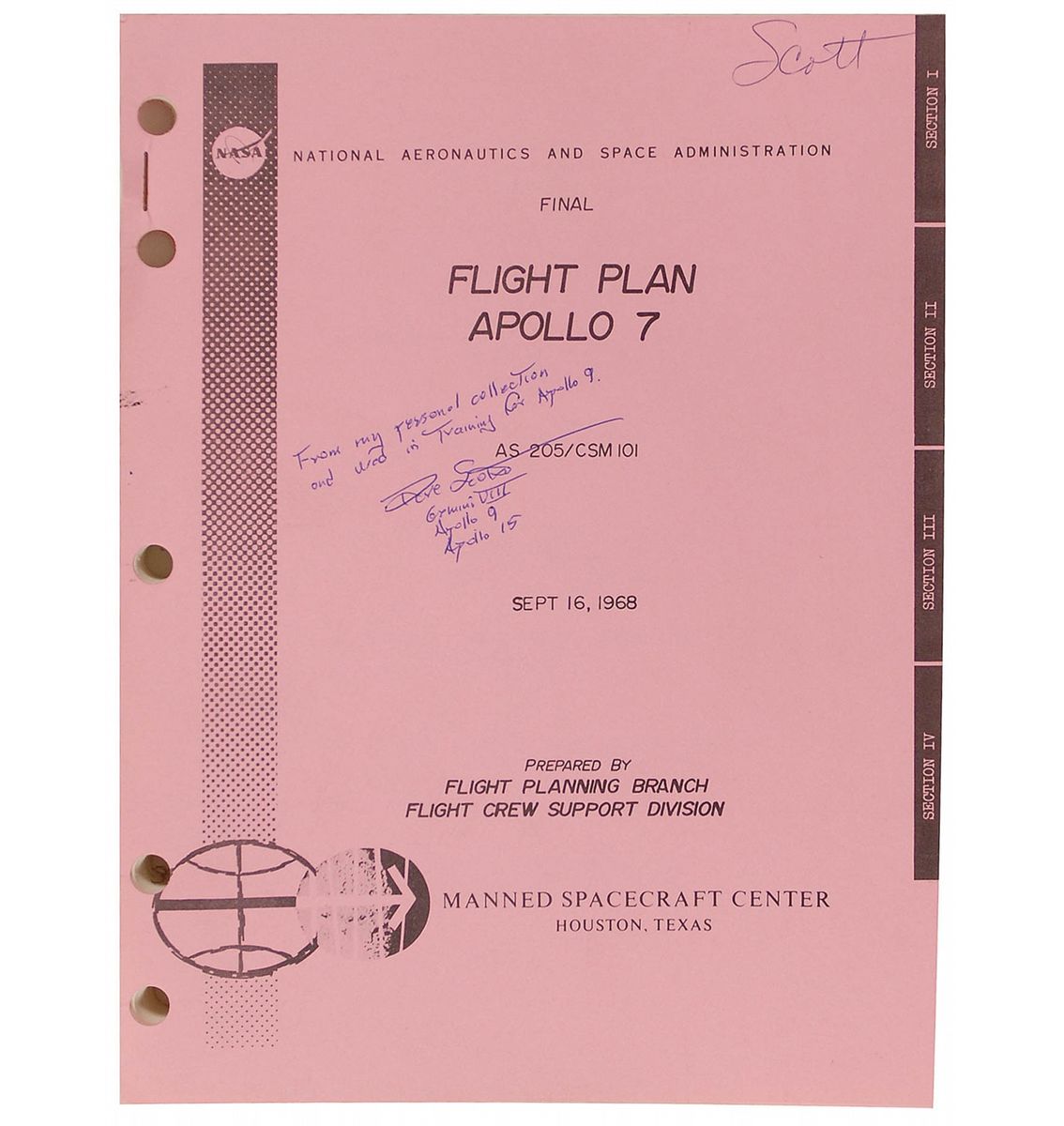 Dave Scott’s training-used printed Apollo 7 final Flight Plan, dated September 16, 1968, measuring 8 x 10.5, bound by a staple to the left edge, and providing a minute-by-minute time frame for the entire mission. First page is a copy of the flight plan submission bearing copies of signatures of William Anderson, Warren North, Deke Slayton, George Low, and Chris Kraft. Signed on the front cover in blue ballpoint, “From my personal collection and used in training for Apollo 9. Dave Scott, Gemini VIII, Apollo 9, Apollo 15.” In fine condition, with ink notation to front cover and mild handling wear.