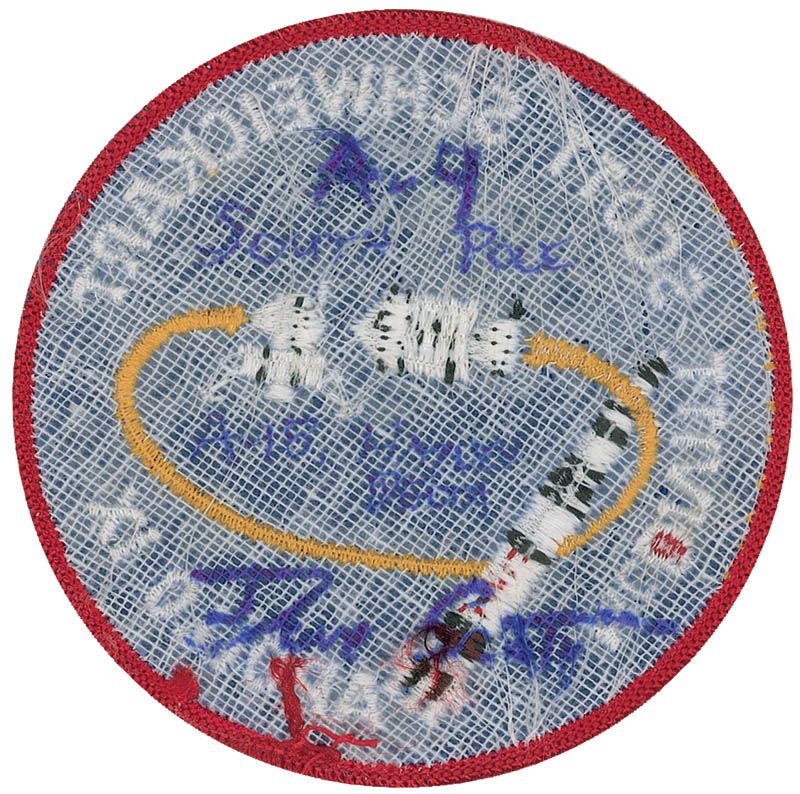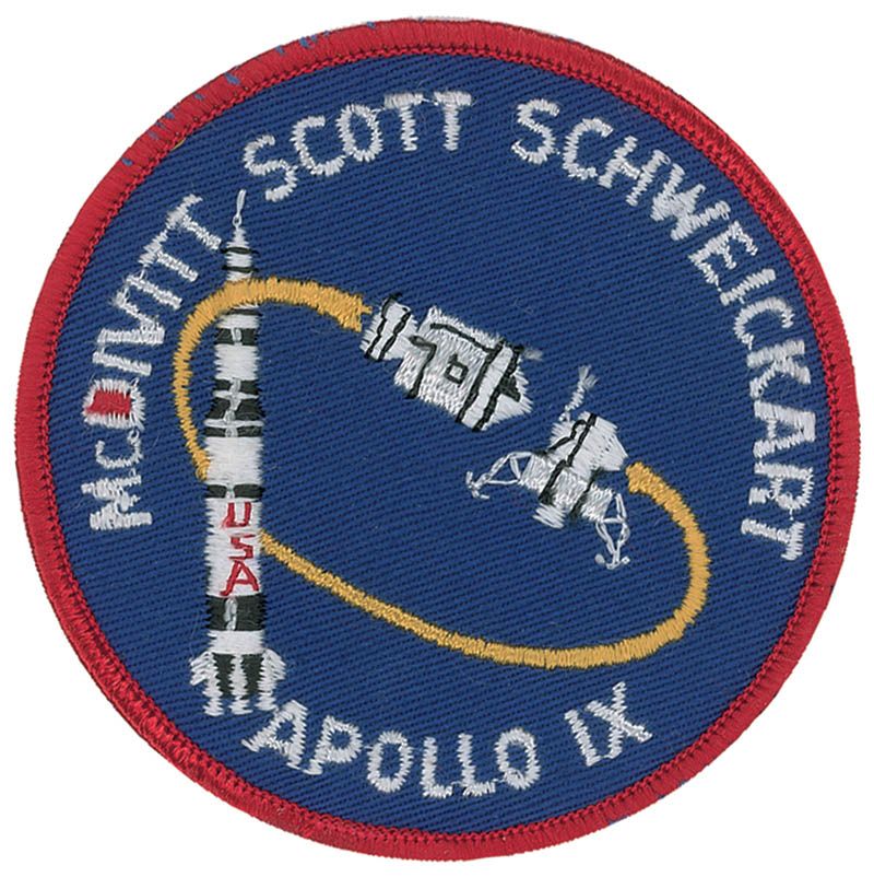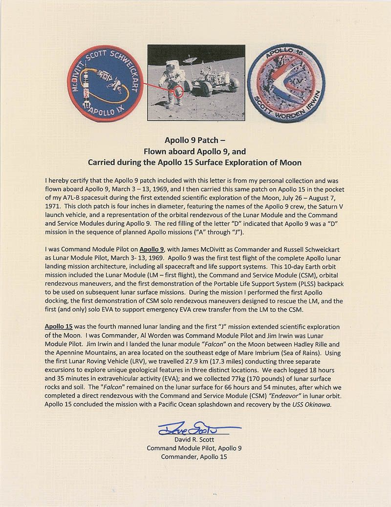 Flown embroidered Apollo 9 mission patch, measuring 3.5? in diameter, carried on board Apollo 9, and carried again in the pocket of Dave Scott’s space suit during all three EVAs during the Apollo 15 mission, and also carried to the South Pole in 1970. Signed on the reverse in blue ink and felt tip, “A-9, South Pole, A-15 Hadley Delta. Dave Scott.” Accompanied by a letter of authenticity from Dave Scott stating, in part: “I hereby certify that the Apollo 9 patch included with this letter is from my personal collection and was flown aboard Apollo 9…and I then carried this same patch on Apollo 15 in the pocket of my A7L-B spacesuit.” In fine condition.