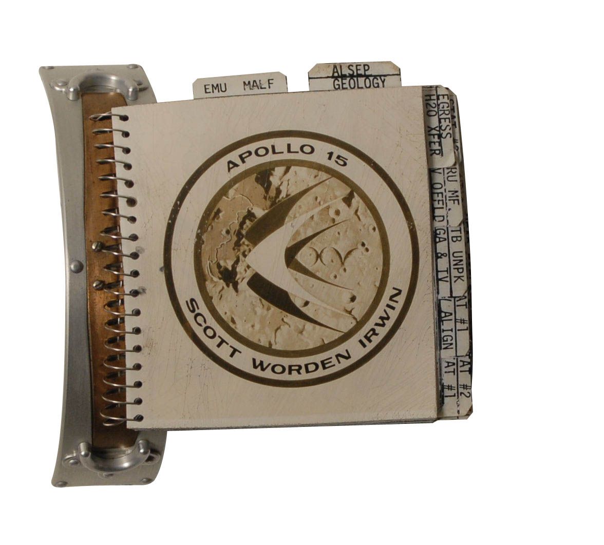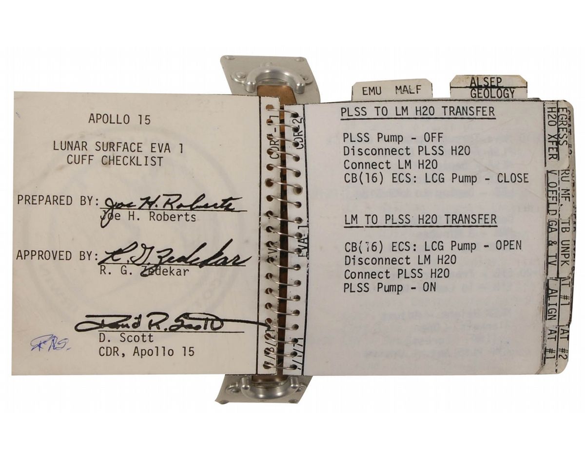 Unbelievably rare and historically significant lunar surface extravehicular activity (EVA) Cuff Checklist worn and used by Apollo 15 commander Dave Scott. 20 double-sided pages, 3.75” x 3.5”, with metal spiral binding working into a curved, 6.25” aluminum arm brace with Velcro wristband to hold it in place around the outside of Scott’s EVA space suit. Inside of cover bears the printed signatures of Joe H. Roberts, R. G. Zedekar, and Dave Scott, and is also initialed in blue ballpoint by Dave Scott. Includes letter of provenance from Dave Scott.