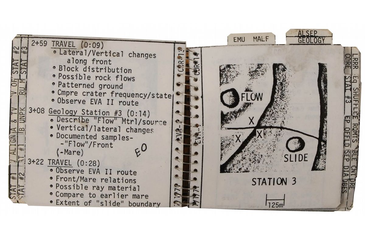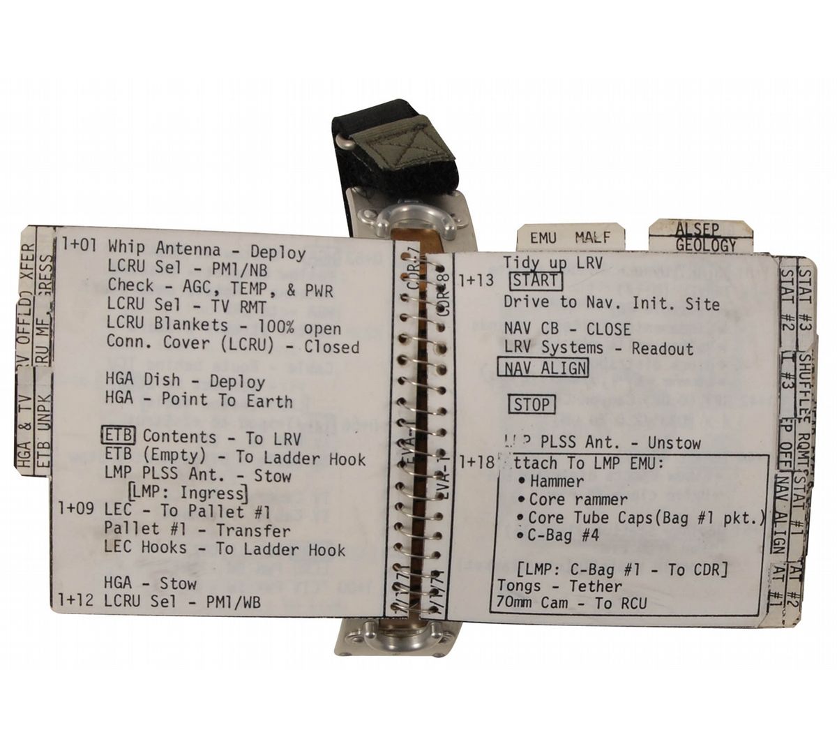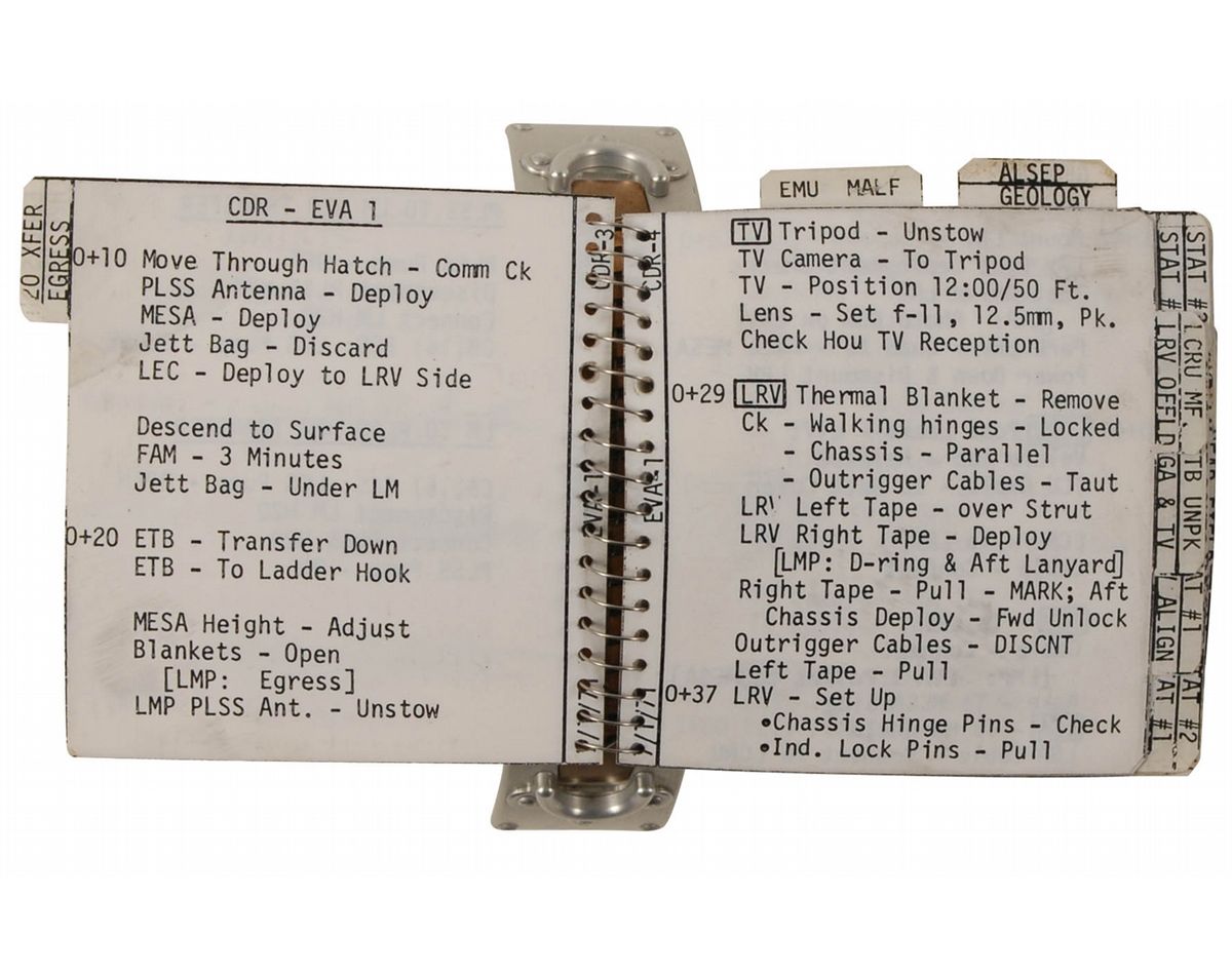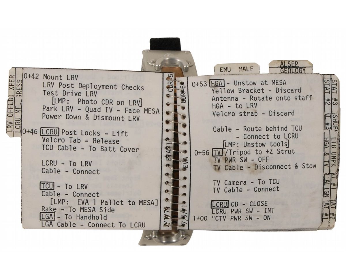Highly prized, and greatly sought after, this mission critical cuff checklist is coated in lunar dust from its extensive use by Scott as he and fellow astronaut Jim Irwin explored their landing site at the Marsh of Decay, Elbow Crater, and St. George Crater during the mission’s first EVA. Securely mounted on Dave Scott’s left wrist for over 6 hours and 33 minutes on the surface, this rare checklist also guided the astronaut in the collection and stowage of the first contingency lunar sample, deploying the Lunar Roving Vehicle (LRV), unstowing the Apollo Lunar Surface Experiments Package (ALSEP) and configured the LRV for its first drive, among other important mission and contingency activities.