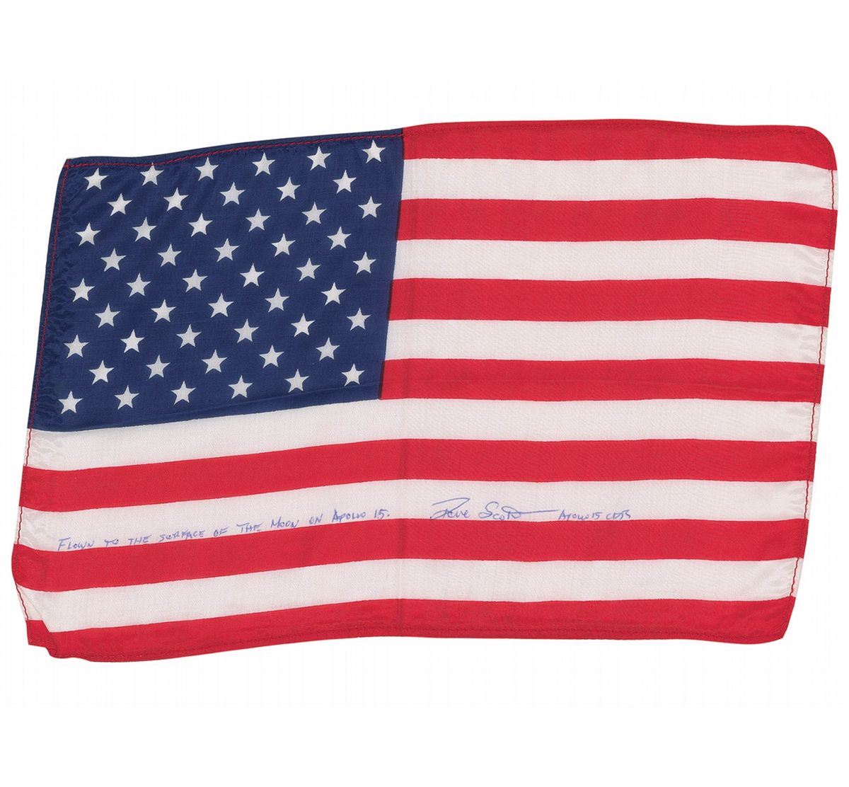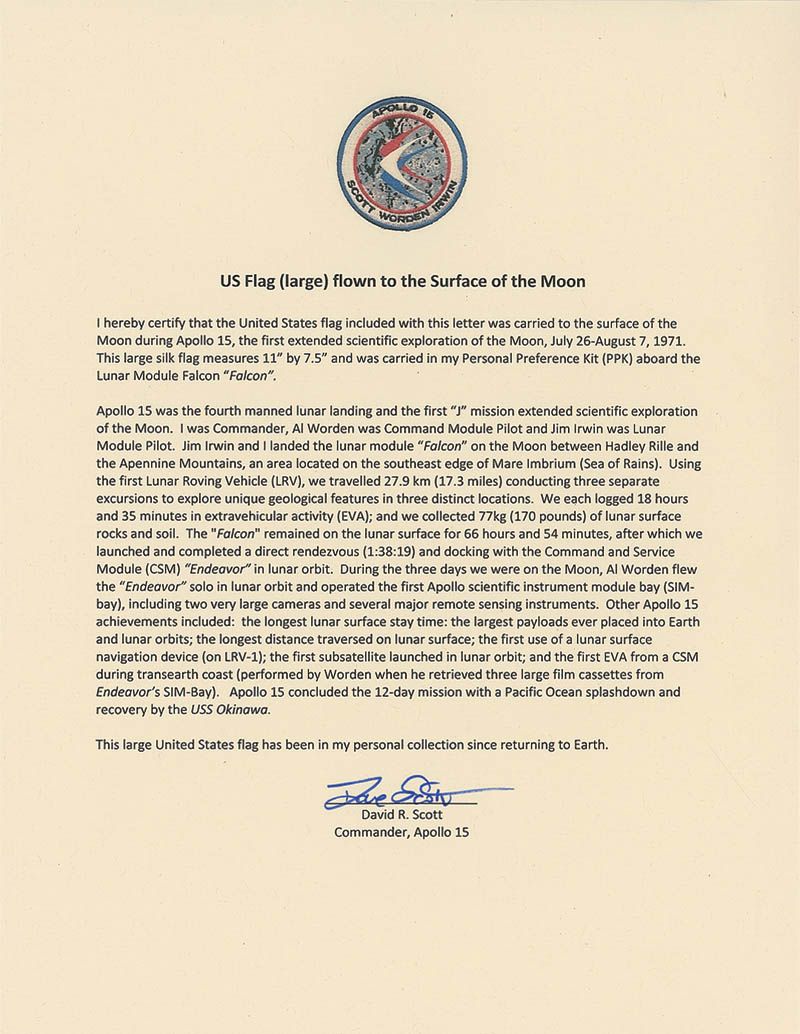 Large flown printed fabric American flag, 11 x 7.5, carried to the lunar surface on board Apollo 15. Signed in blue ink on a white stripe, “Flown to the surface of the moon on Apollo 15. Dave Scott, Apollo 15 CDR.” Accompanied by a letter of authenticity from Dave Scott stating, in part, “I hereby certify that the United States flag included with this letter was carried to the surface of the Moon during Apollo 15; this large silk flag measures 11? x 7.5? and was carried in my Personal Preference Kit (PPK) aboard the Lunar Module Falcon…This large United States flag has been in my personal collection since returning to Earth.” In fine condition, with a central vertical crease.