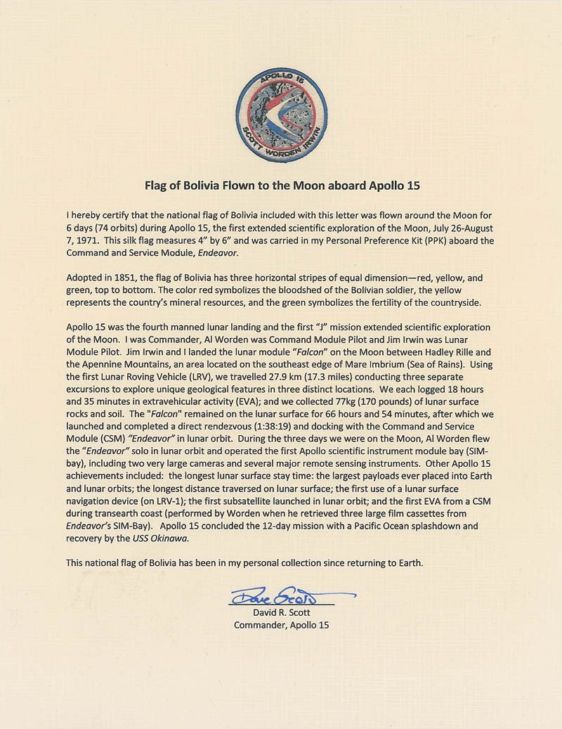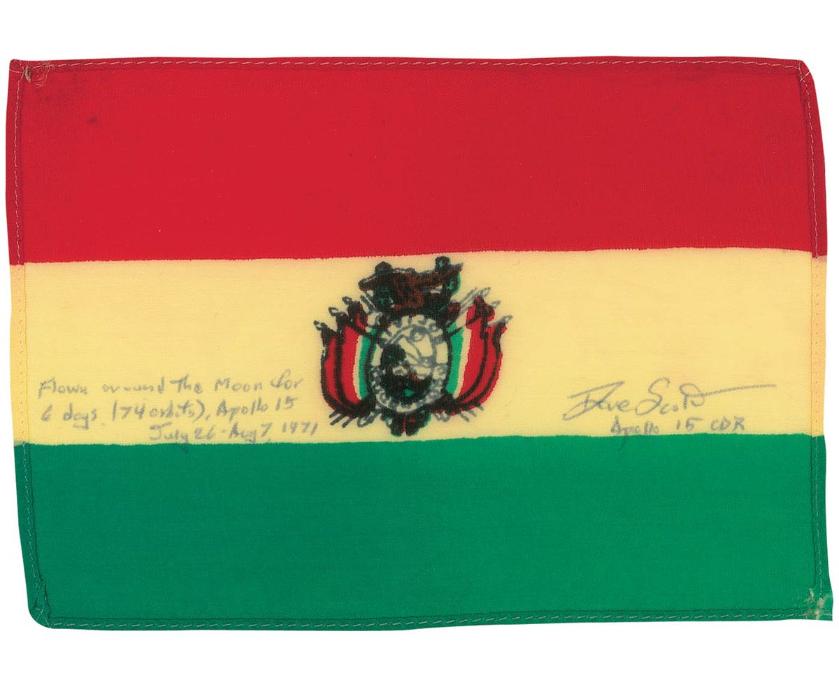 Flown printed fabric Bolivian flag, 6 x 4, flown to lunar orbit aboard Apollo 15, signed in blue ink on the yellow panel, “Flown around the Moon for 6 days (74 orbits), Apollo 15, July 26–Aug 7, ‘71, Dave Scott, Apollo 15 CDR.” Accompanied by a letter of authenticity from Scott which reads, in part: “I hereby certify that the national flag of Bolivia included with this letter was flown around the moon for 6 days (74 orbits) during Apollo 15…July 26-August 7, 1971…and was carried in my Personal Preference Kit (PPK) aboard the Command and Service Module, Endeavor…This national flag of Bolivia has been in my personal collection since returning to Earth.” In fine condition.