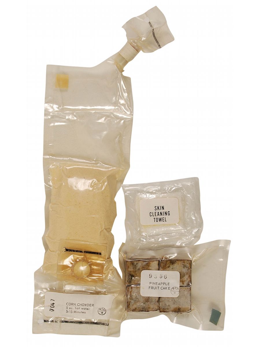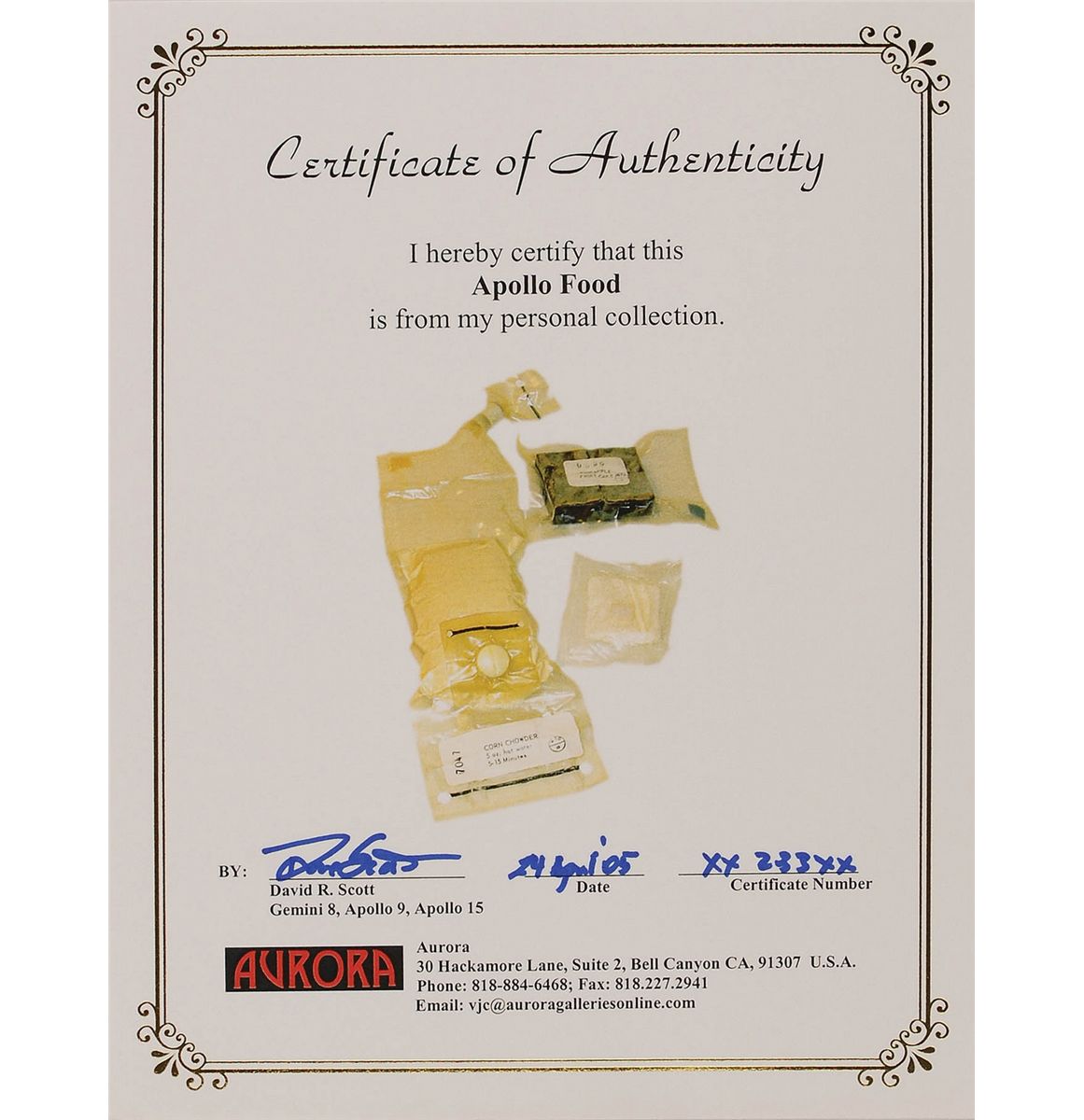 Unique freeze-dried ‘space food’ from the collection of Apollo 15 commander Dave Scott. The first item, labeled “Corn Chowder,” measures 3.5 x 11 and rests within a sealed pouch to which a nozzle is attached. The label also bears the simple heating instructions; the other is a 4.5 x 3.5 block of four pieces labeled “Pineapple Fruit Cake.” Also included is a sealed skin cleaning towel. Accompanied by a letter of authenticity from Dave Scott stating “I hereby certify that this Apollo Food is from my personal collection.” In fine condition.