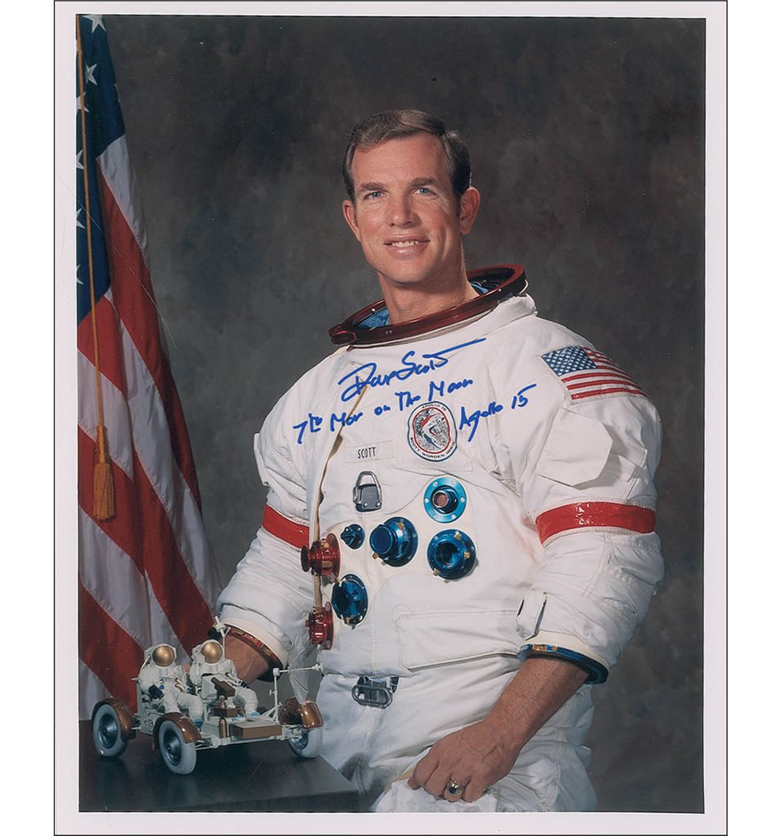 Color satin-finish 8 x 10 photo of Scott in his spacesuit posing with a model of the lunar rover, signed in blue felt tip, “Dave Scott 7th Man on the Moon, Apollo 15.” In very fine condition.