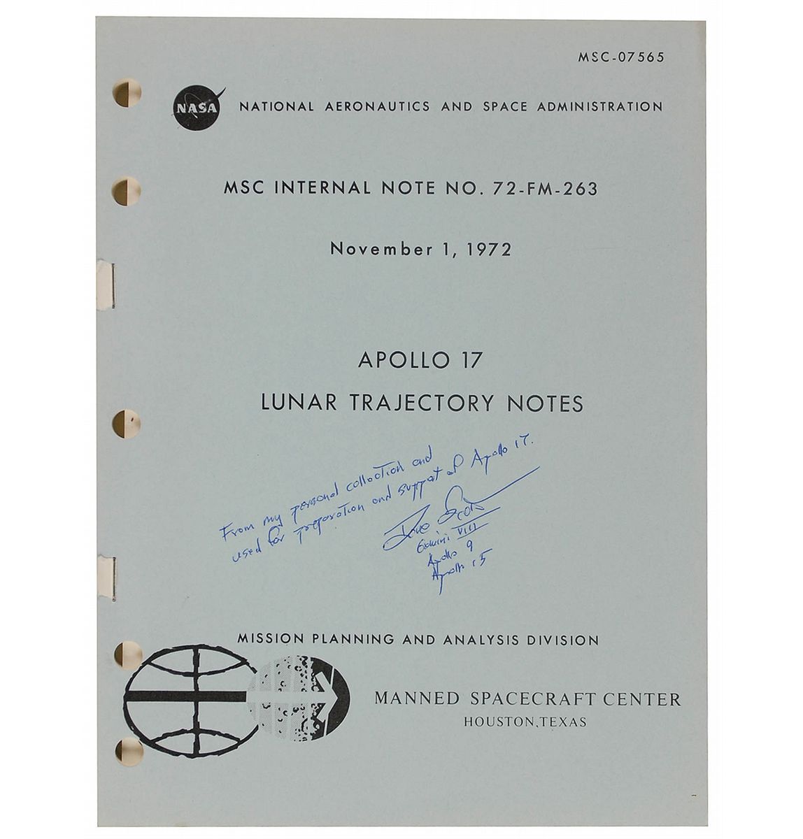 Dave Scott’s printed Apollo 17 Lunar Trajectory Notes, dated November 1, 1972, 8 x 10.5, 264 pages bound by two staples to the left edge. Manual contains information on the Apollo 17 mission, brief histories of previous lunar flights, and how a trajectory is determined for a mission to the moon. Signed on the front cover in blue ballpoint, “From my personal collection and used for preparation and support of Apollo 17. Dave Scott, Gemini VIII, Apollo 9, Apollo 15.” In fine condition, with some light soiling to fore-edges.