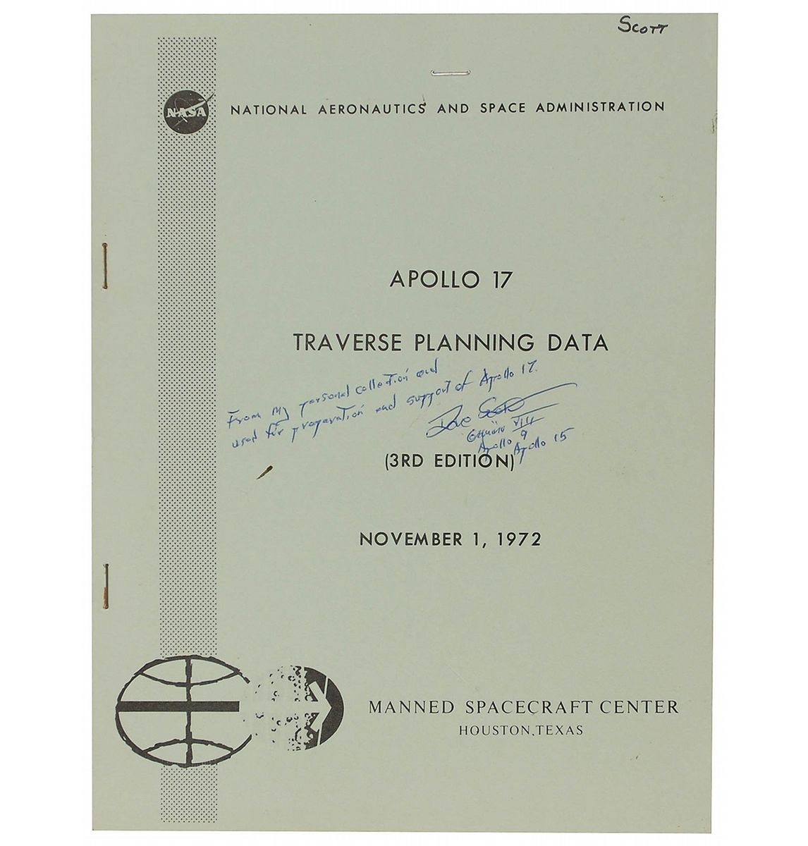 Dave Scott’s printed Apollo 17 Traverse Planning Data (Third Edition), dated November 1, 1972, 8 x 10.5, 116 pages bound by two staples to the left edge. Manual contains information on the small changes to the Apollo 17 mission, including experiments and EVAs. Signed on the front cover in blue ballpoint, “From my personal collection and used for preparation and support of Apollo 17. Dave Scott, Gemini VIII, Apollo 9, Apollo 15.” In fine condition, with some light soiling to fore-edges.