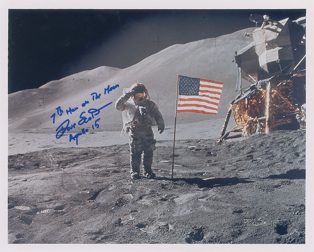 Color satin-finish 10 x 8 photo of Scott saluting the flag on the lunar surface, signed in blue felt tip, “7th Man on the Moon, Dave Scott, Apollo 15.” In very fine condition.