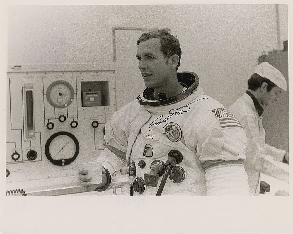 Glossy 10 x 8 NASA photo of Scott having a drink while preparing for the Apollo 15 mission, signed in black felt tip. In fine condition, with a few small edge creases.