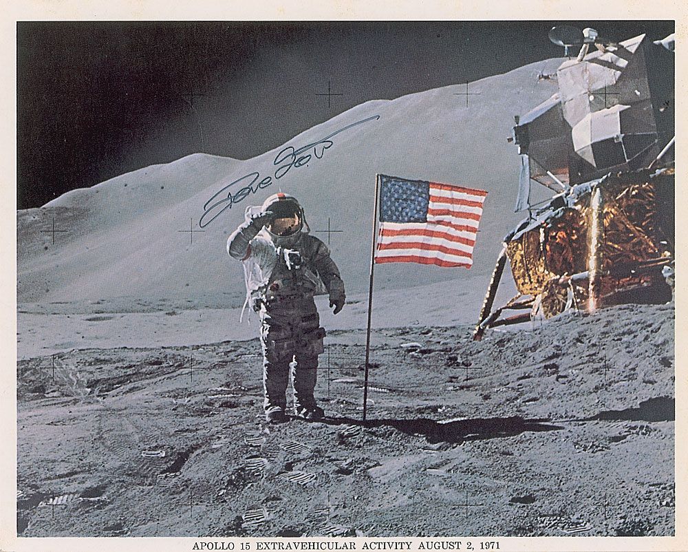 Color 10 x 8 NASA photo of Scott saluting the American flag on the lunar surface, signed in black felt tip. In fine condition.