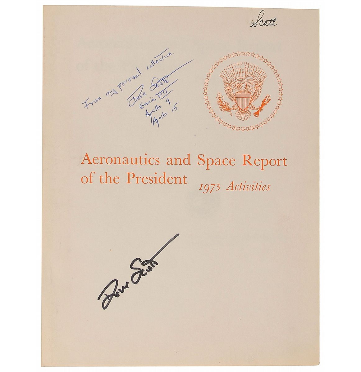 Dave Scott’s printed Aeronautics and Space Report of the President, 1973 Activities, 8 x 10, 131 pages. Report was made for President Richard Nixon to present the nation’s progress in space activities. Signed on the front cover in black felt tip by Scott, and signed again in blue ballpoint, “From my personal collection. Dave Scott, Gemini VIII, Apollo 9, Apollo 15.” In fine condition, with an ink notation and light toning to cover.