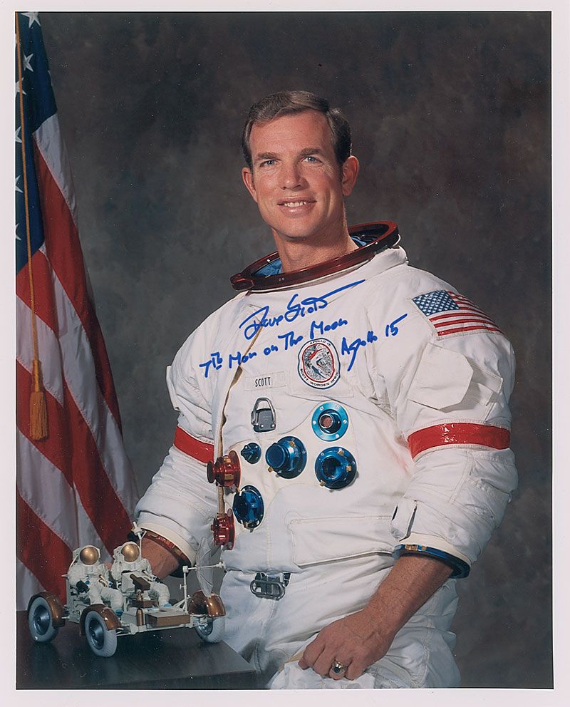 Color satin-finish 8 x 10 photo of Scott in his white spacesuit, signed in blue felt tip, “Dave Scott, 7th Man on the Moon, Apollo 15.” In very fine condition.