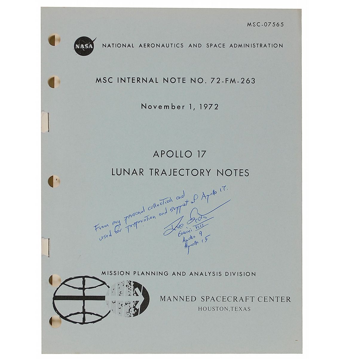Dave Scott’s printed Apollo 17 Lunar Trajectory Notes, dated November 1, 1972, 8 x 10.5, 264 pages bound by two staples to the left edge. Manual contains information on the Apollo 17 mission, brief histories of previous lunar flights, and how a trajectory is determined for a mission to the moon. Signed on the front cover in blue ballpoint, “From my personal collection and used for preparation and support of Apollo 17. Dave Scott, Gemini VIII, Apollo 9, Apollo 15.” In fine condition, with some light soiling to fore-edges.